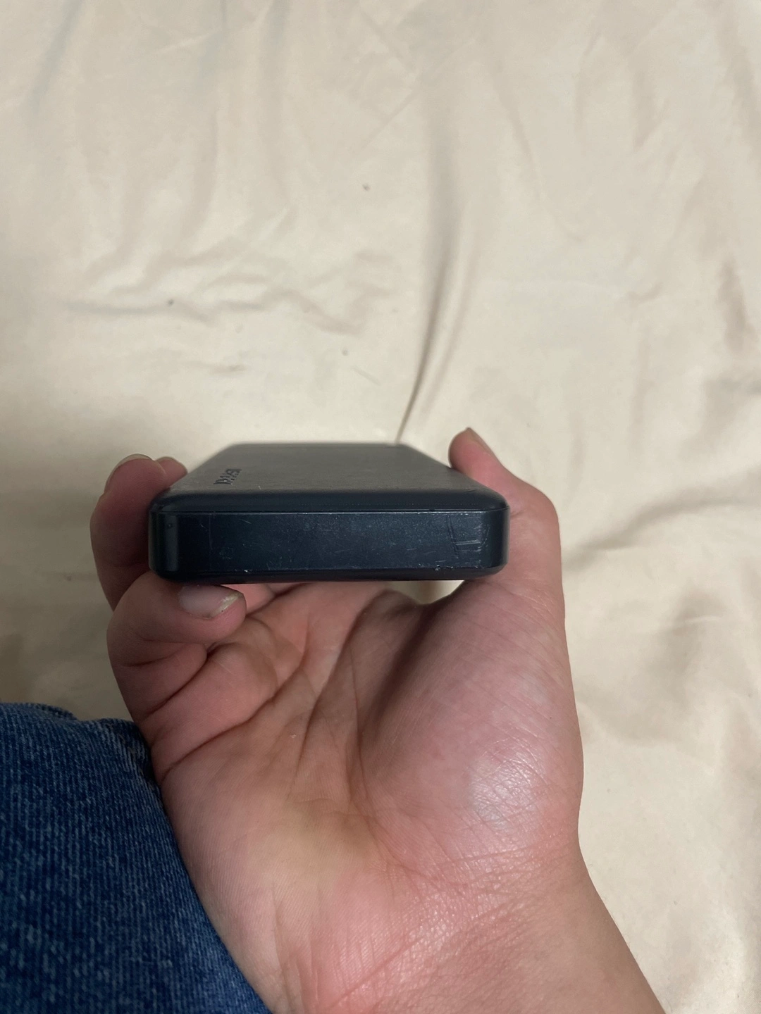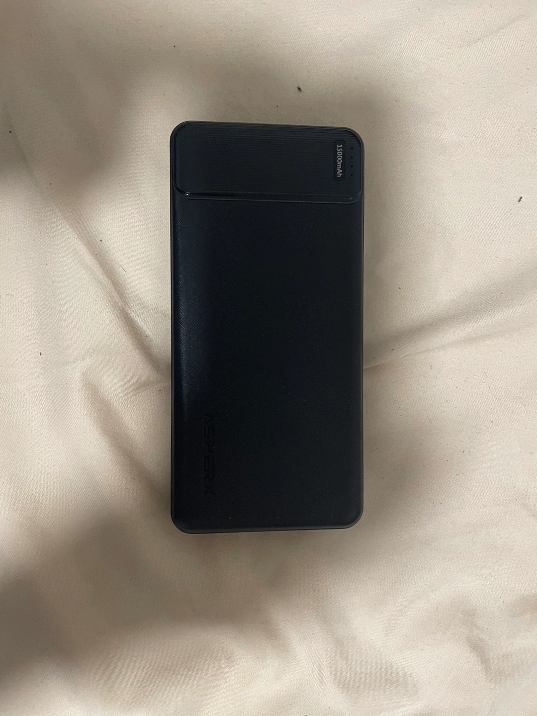 Black portable charger. Multiple USB ports. Compact and lightweight design. 15000mAh capacity.