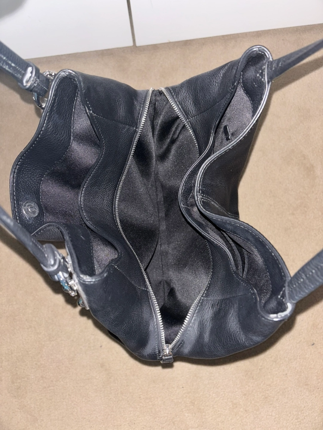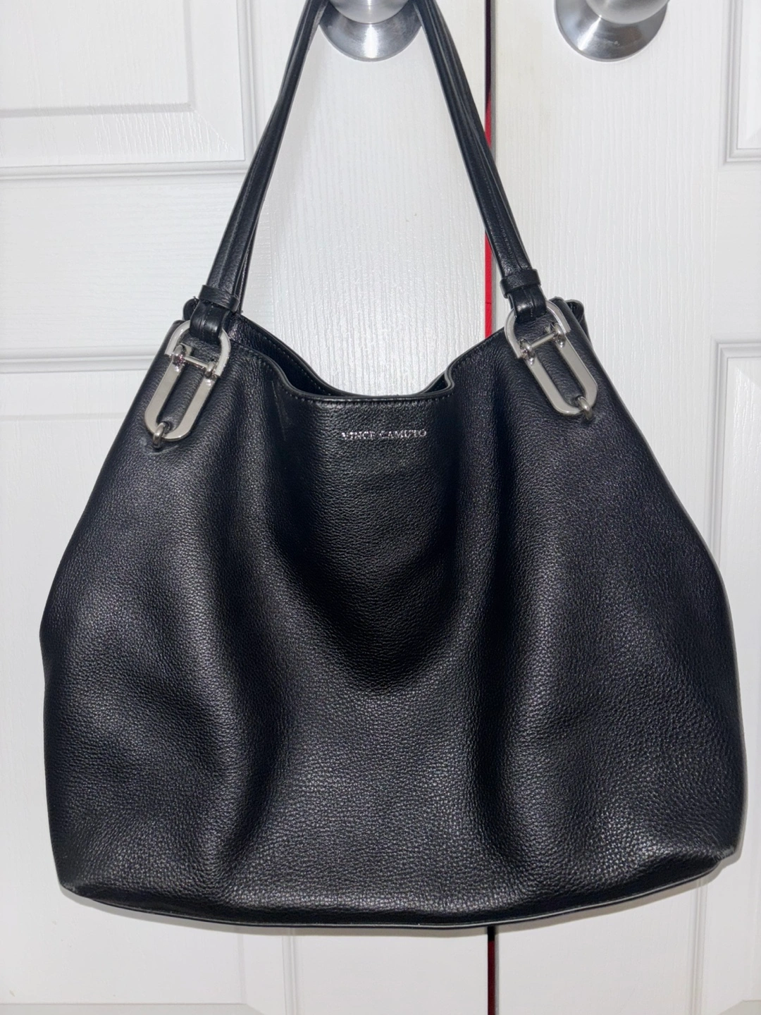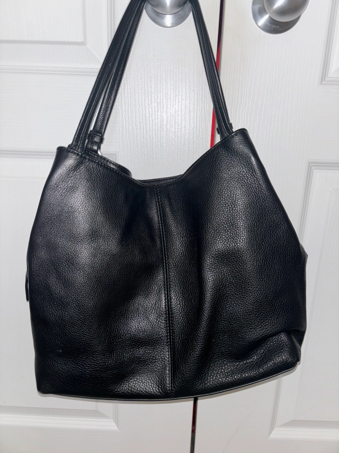 Stylish black leather tote. Features double top handles, 2 open pockets and a zip closure. Roomy interior. Great for everyday use! Only used a handful of times :)