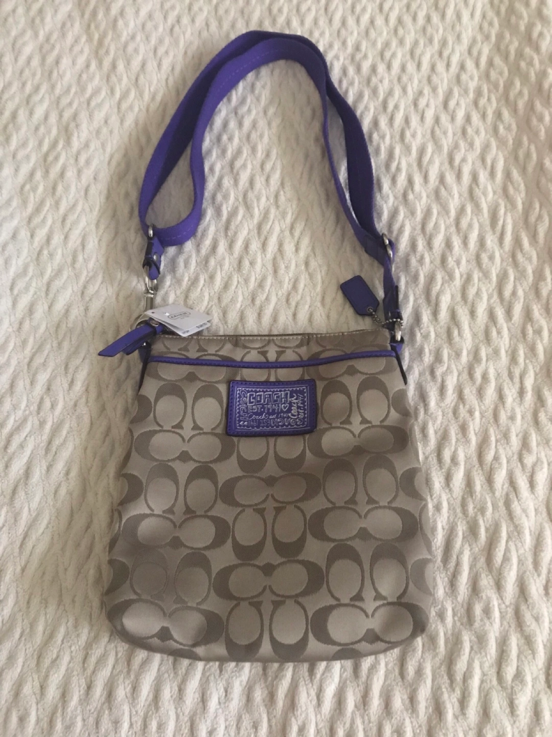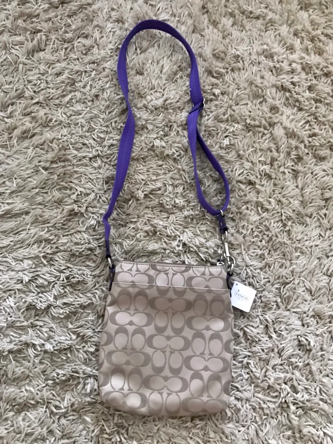Coach crossbody bag. Beige canvas with purple accents. Adjustable strap. New with tags.