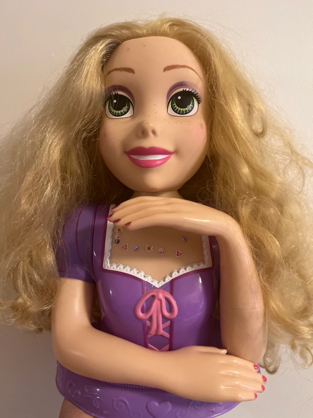 Large Rapunzel styling head. Long blonde hair. Purple dress. Great for kids.