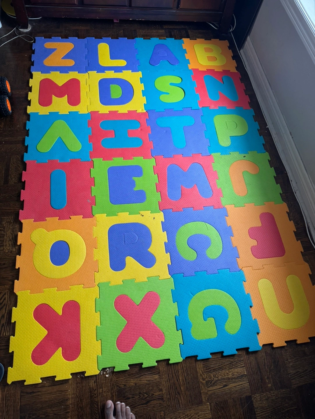 Foam puzzle mat with colourful letters. Great for kids. Interlocking pieces. Fun and educational. Only Y letter is missing