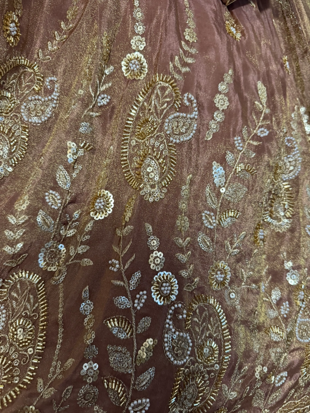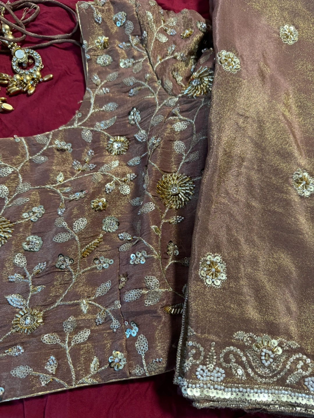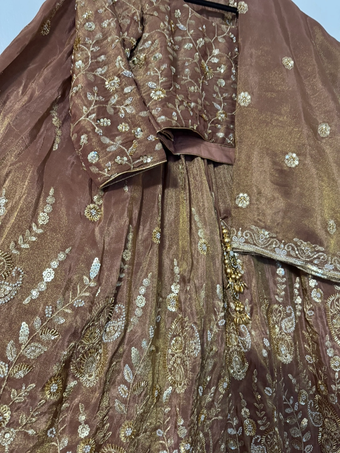 Beautiful coffee lehenga choli. Intricate gold embroidery and embellishments. Three-piece set: lehenga skirt, choli top, and dupatta. Perfect for special occasions.