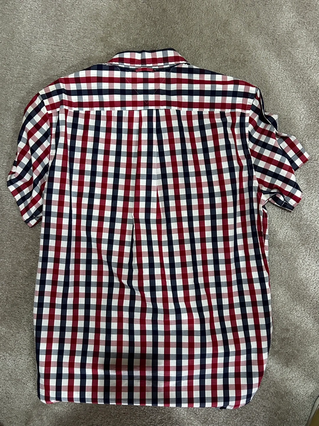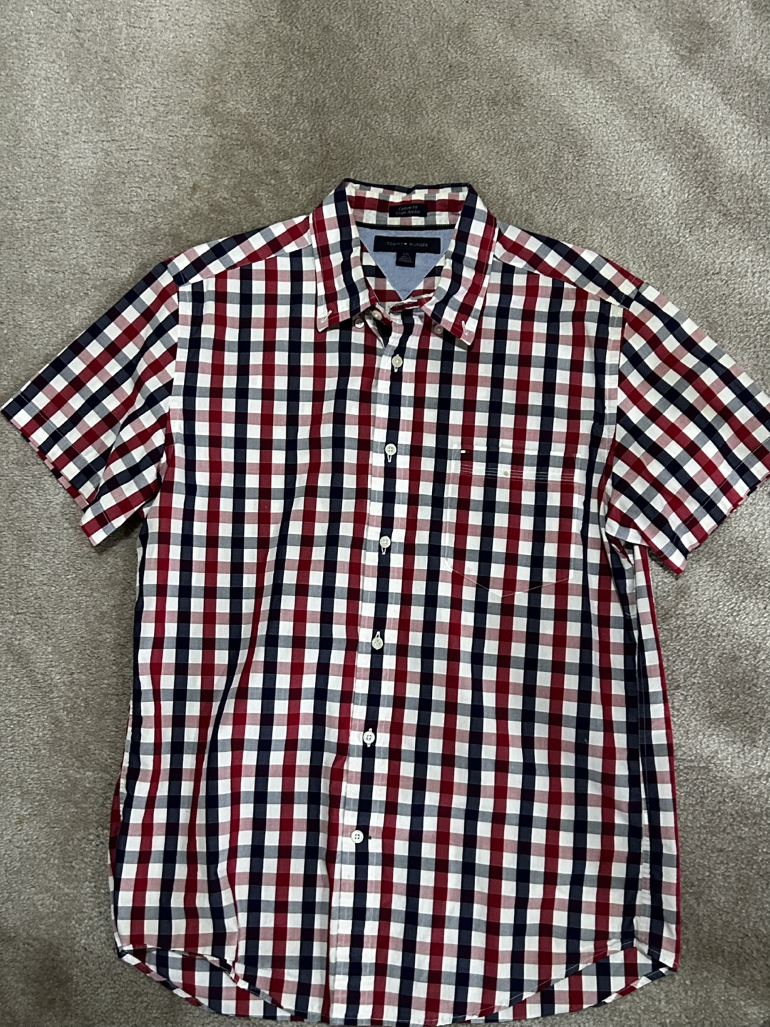 Men's short sleeve button-down shirt. Red, navy, and white gingham pattern. Custom fit. Small pocket on the left chest. Size L/G.