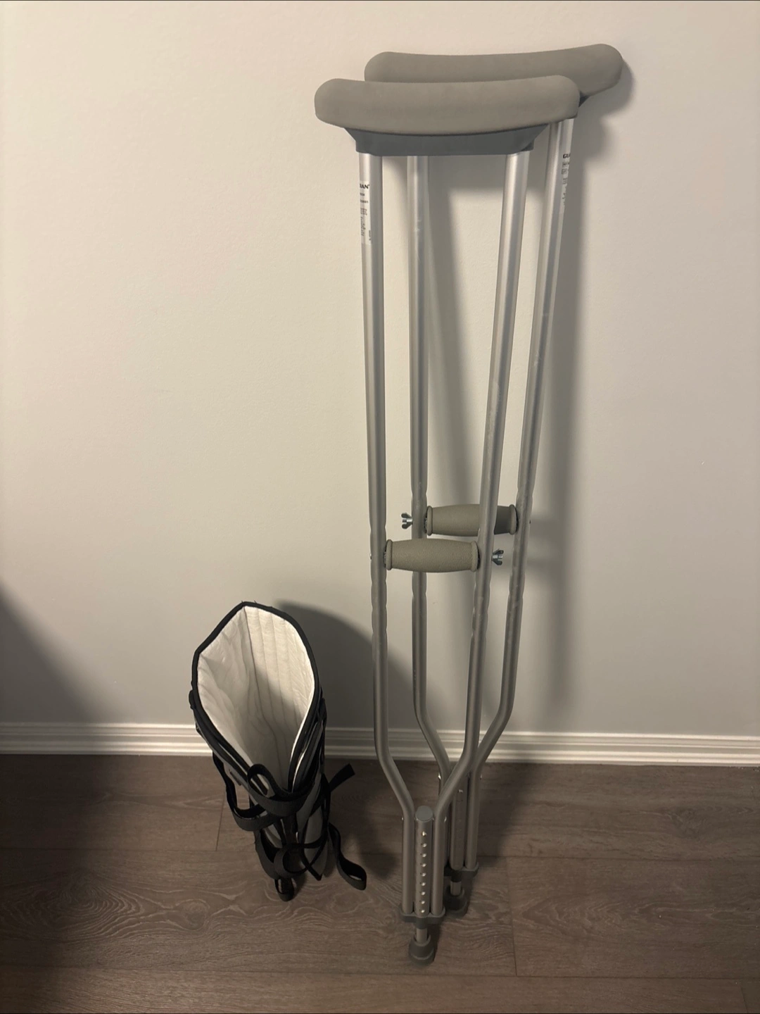 Grey fabric immobilizer with adjustable straps. Aluminum crutches with adjustable padded hand grips. Brand new condition. Suitable for injury recovery or post-surgery.