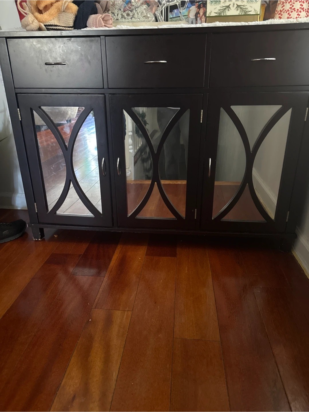 Selling a black cabinet with mirrored doors. It has a sleek design with silver hardware. The cabinet has both drawers and cabinet space for storage. Great for any room!