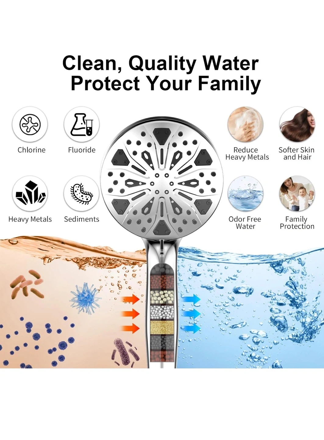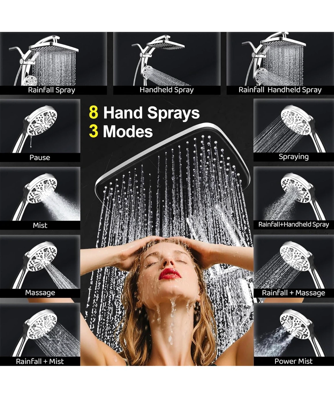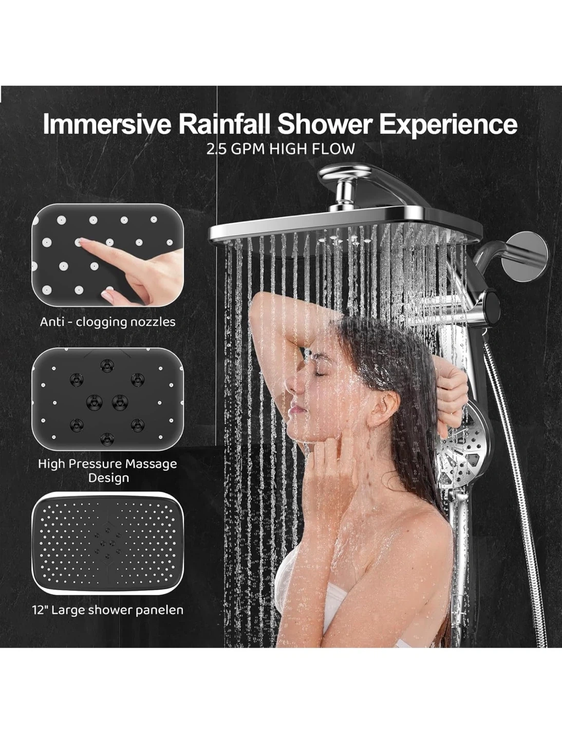 This shower head system offers an immersive rainfall experience with a handheld spray combo. It features anti-clogging nozzles, 8 hand sprays, and 3 modes. The panel is 12" large with high pressure and high flow rate (2.5 GPM).