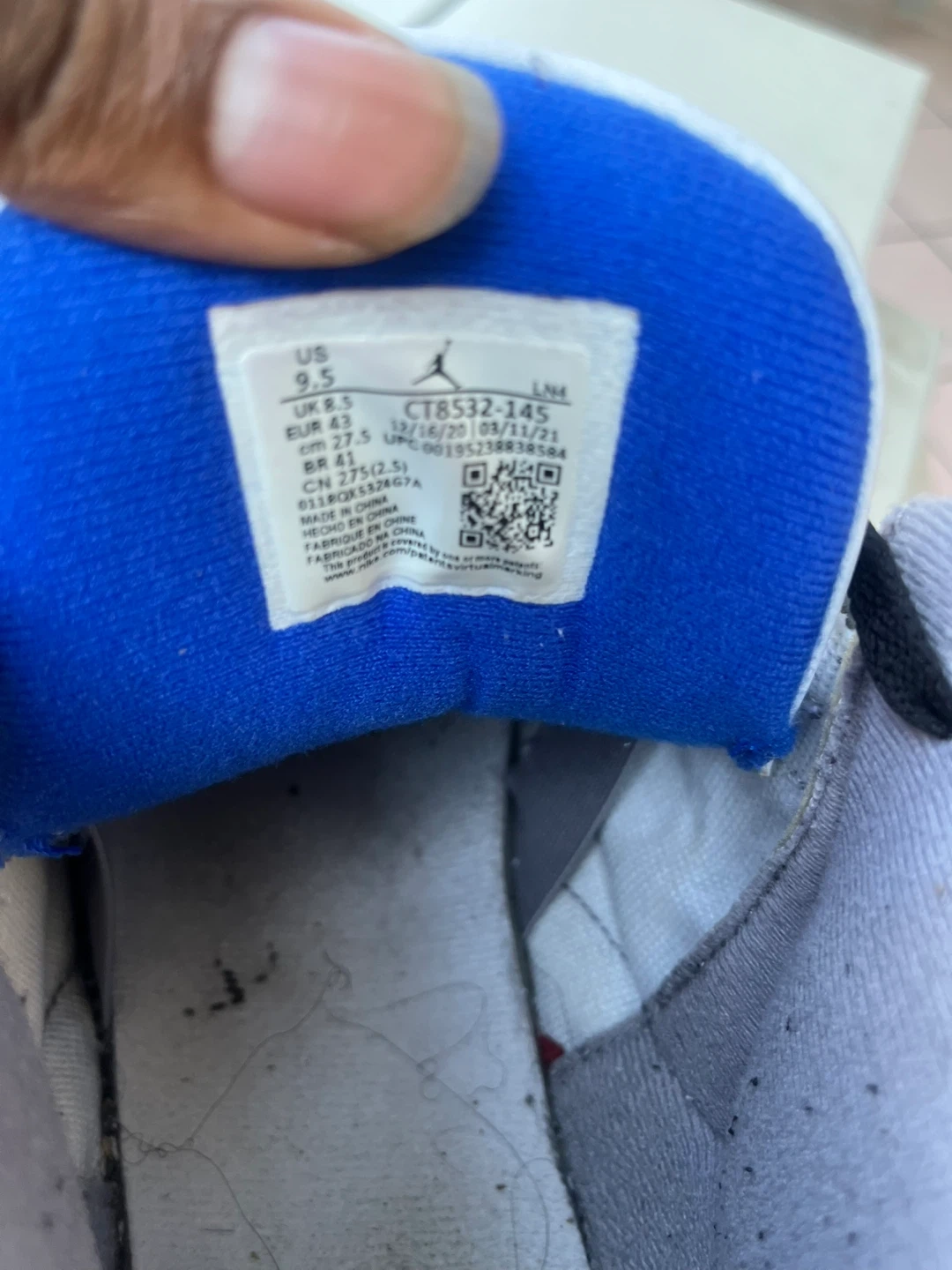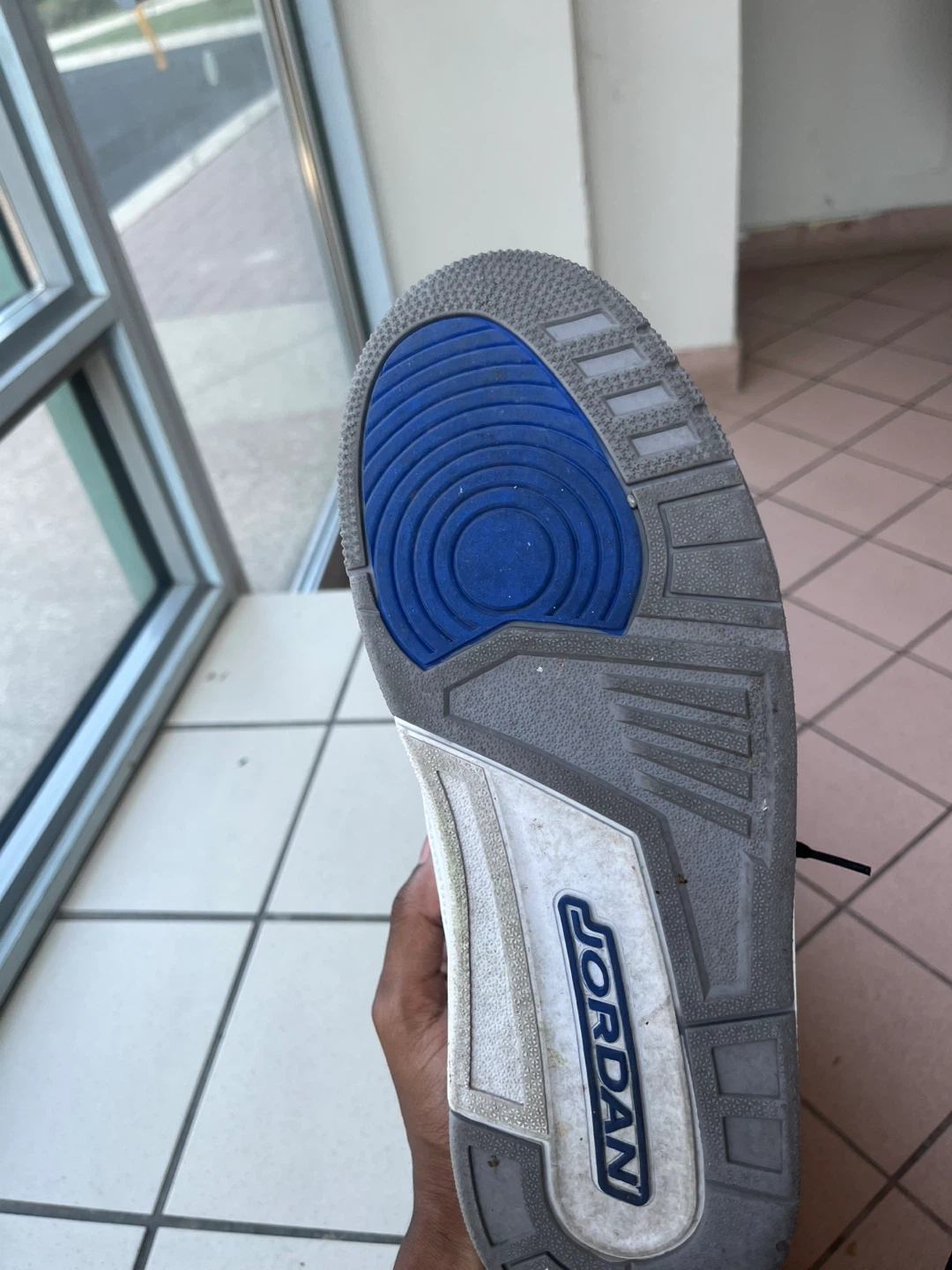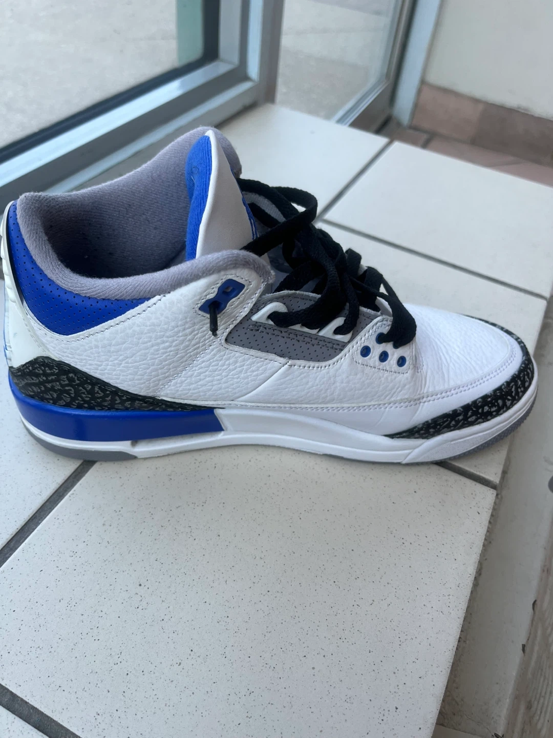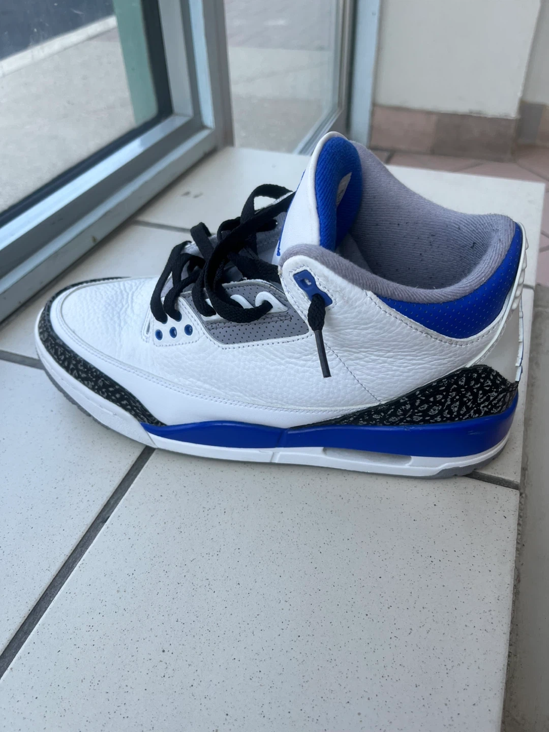 White leather Air Jordan 3 Retro sneakers with blue and grey accents. These shoes feature a Jumpman logo on the insole and outsole. Size US 9.5.