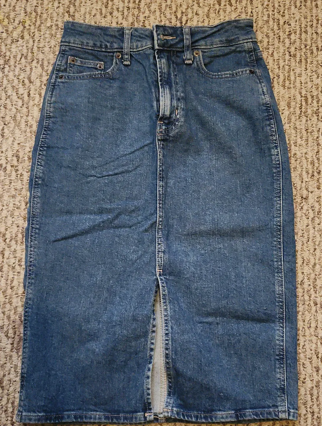 A classic blue denim midi skirt with a front slit. It features a five-pocket design. It's great for everyday wear!