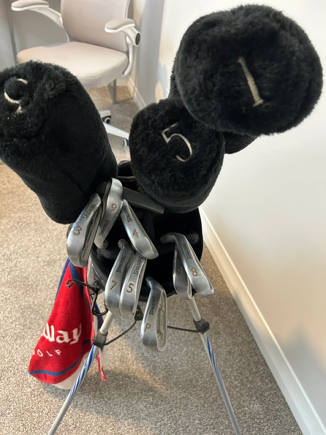 Complete golf club set (bag included). Includes woods, irons, and head covers.