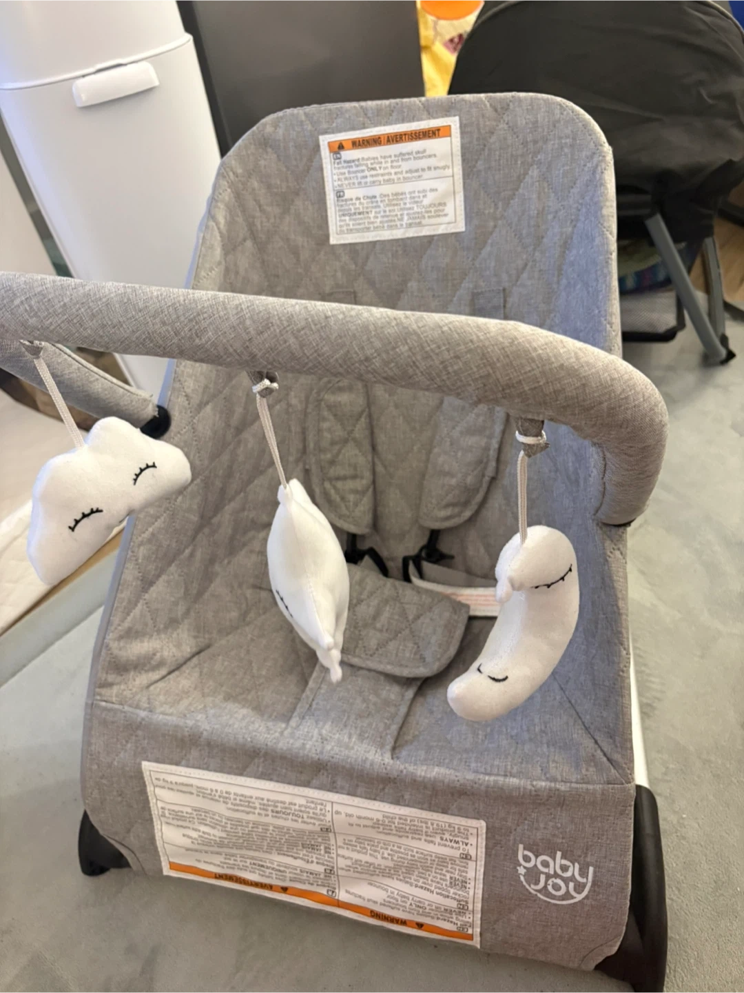 This is a grey Baby Joy rocker chair. It comes with a toy bar featuring plush cloud, moon, and star toys. It's a comfortable spot for your little one.