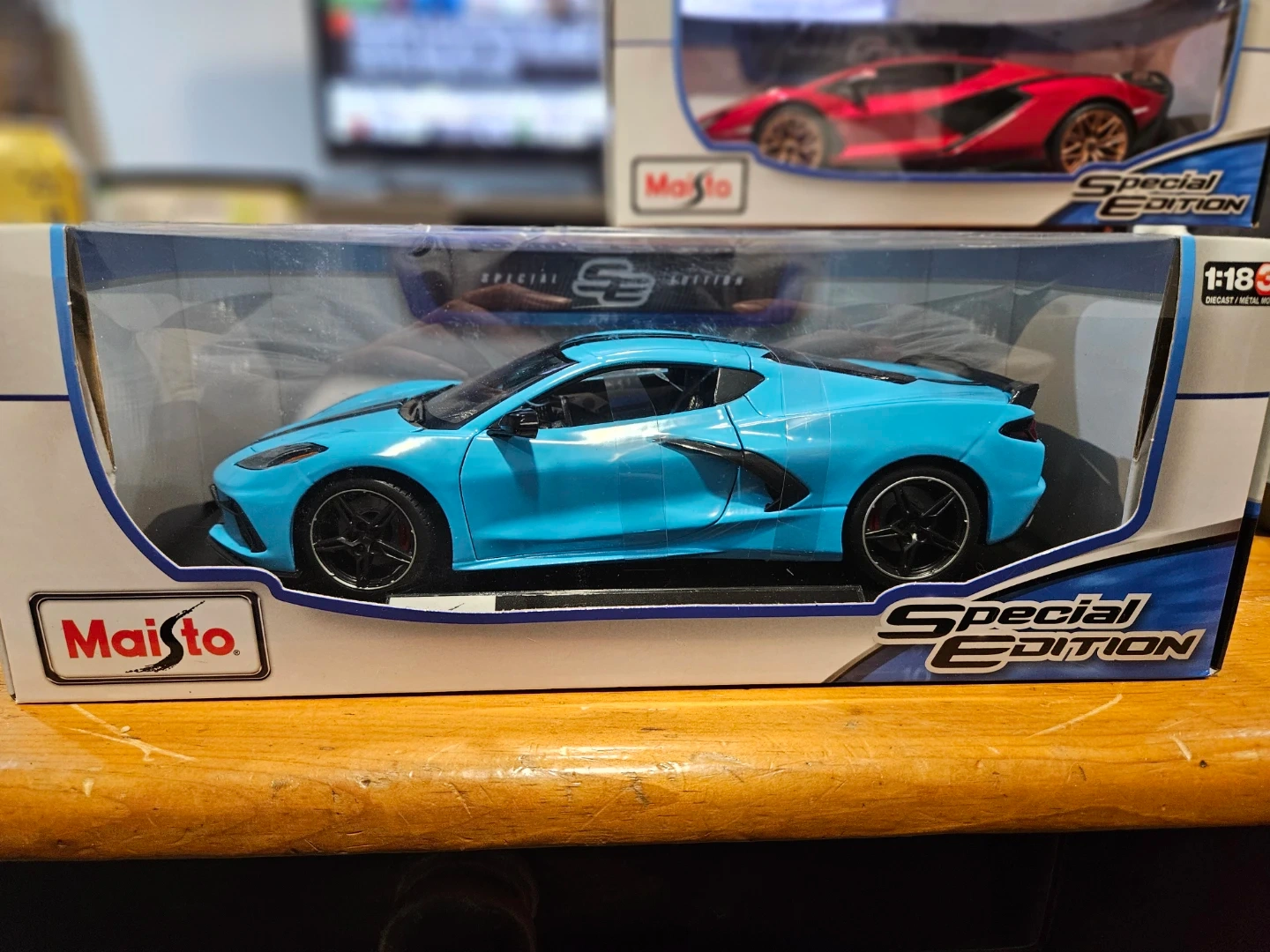 Maisto Special Edition blue Corvette, 1:18 scale die-cast metal model. Comes in original packaging.