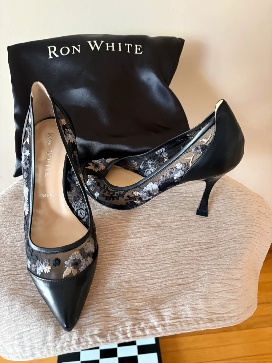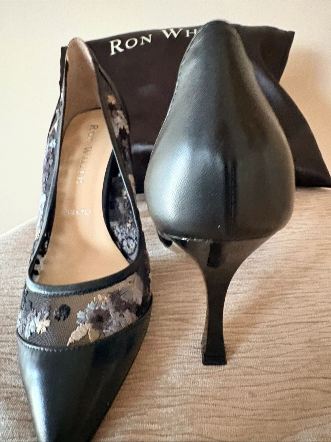 These Ron White heels feature a black leather pointed toe with delicate floral embroidered mesh detailing on the sides. Made in Italy. They come with a Ron White dust bag.