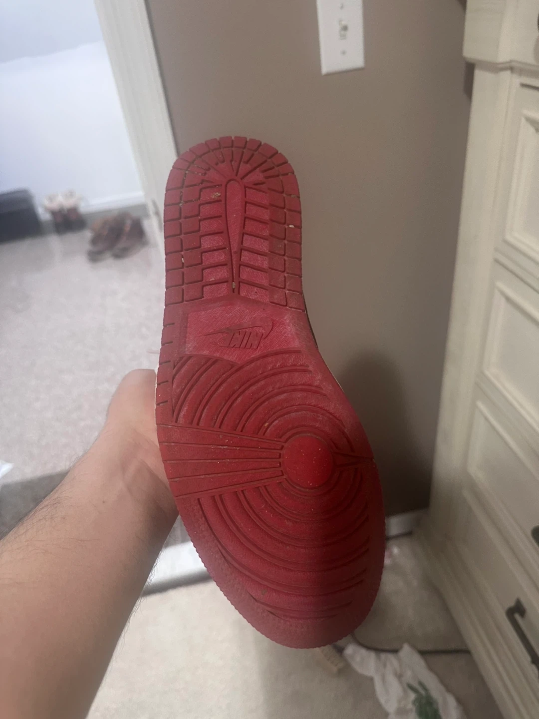Selling a pair of Nike Air Jordan 1 High sneakers in a red and white colorway. They're in used condition, as you can see from the photos of the soles. Still a lot of life left in them!