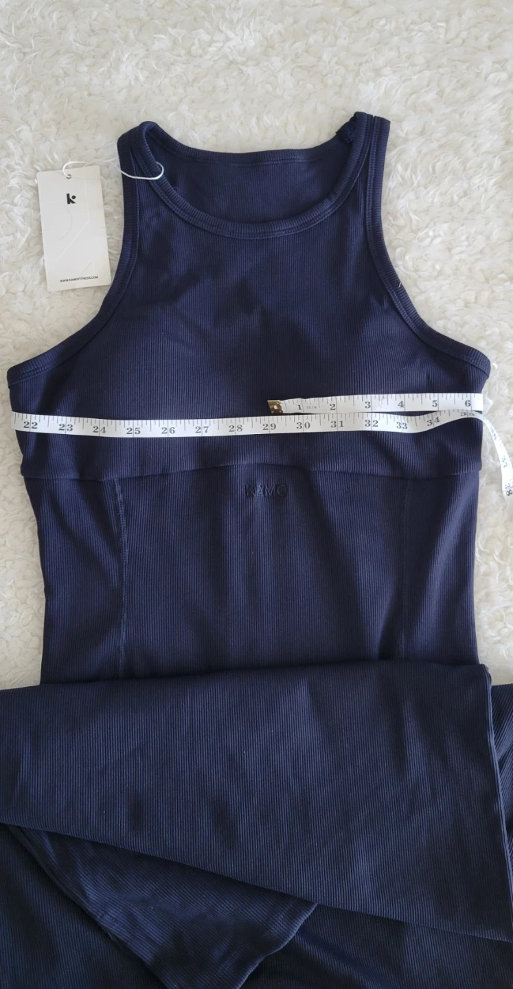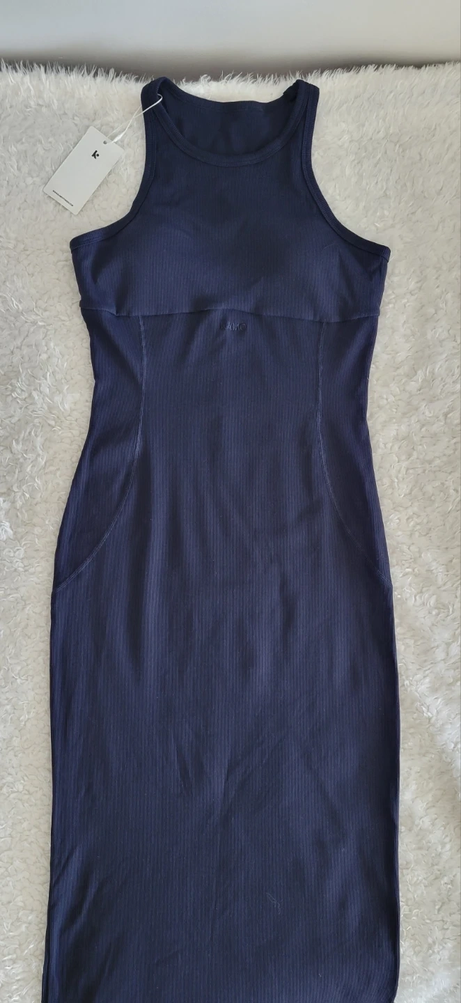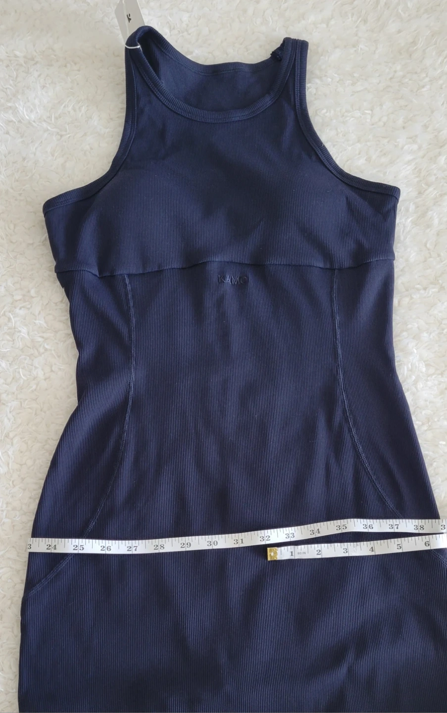 This is a brand-new with tag still attached, Kamo ribbed tank dress in navy. It's made of a comfortable, stretchy material. It has a built-in padded bra. The dress has a flattering fit and a subtle Kamo logo. It's perfect for casual wear or layering!