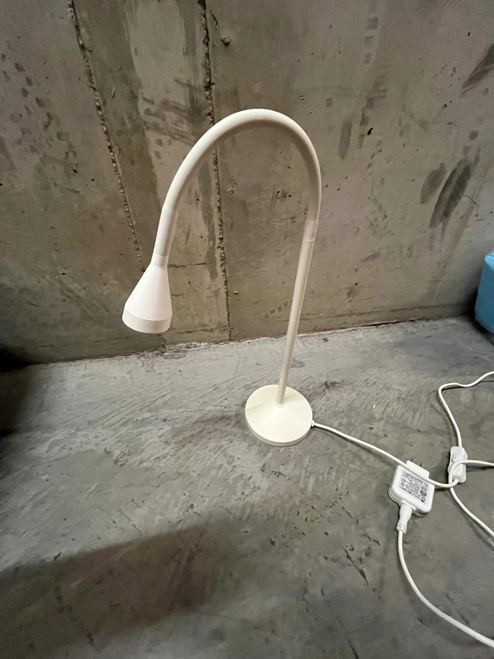 White desk lamp with a flexible neck and a small white base. The lamp is in good condition and no damage. The lamp is about 10 inches tall.