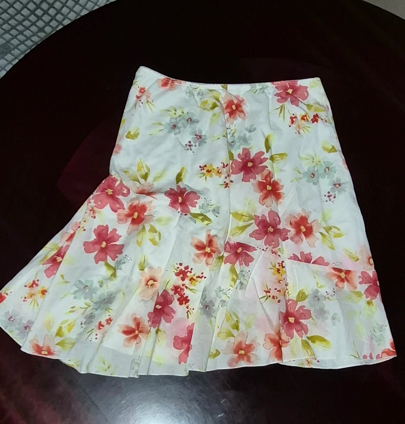 This floral flirty skirt is made with 100% cotton and a polyester lining. It's a size medium. Handwash cold.