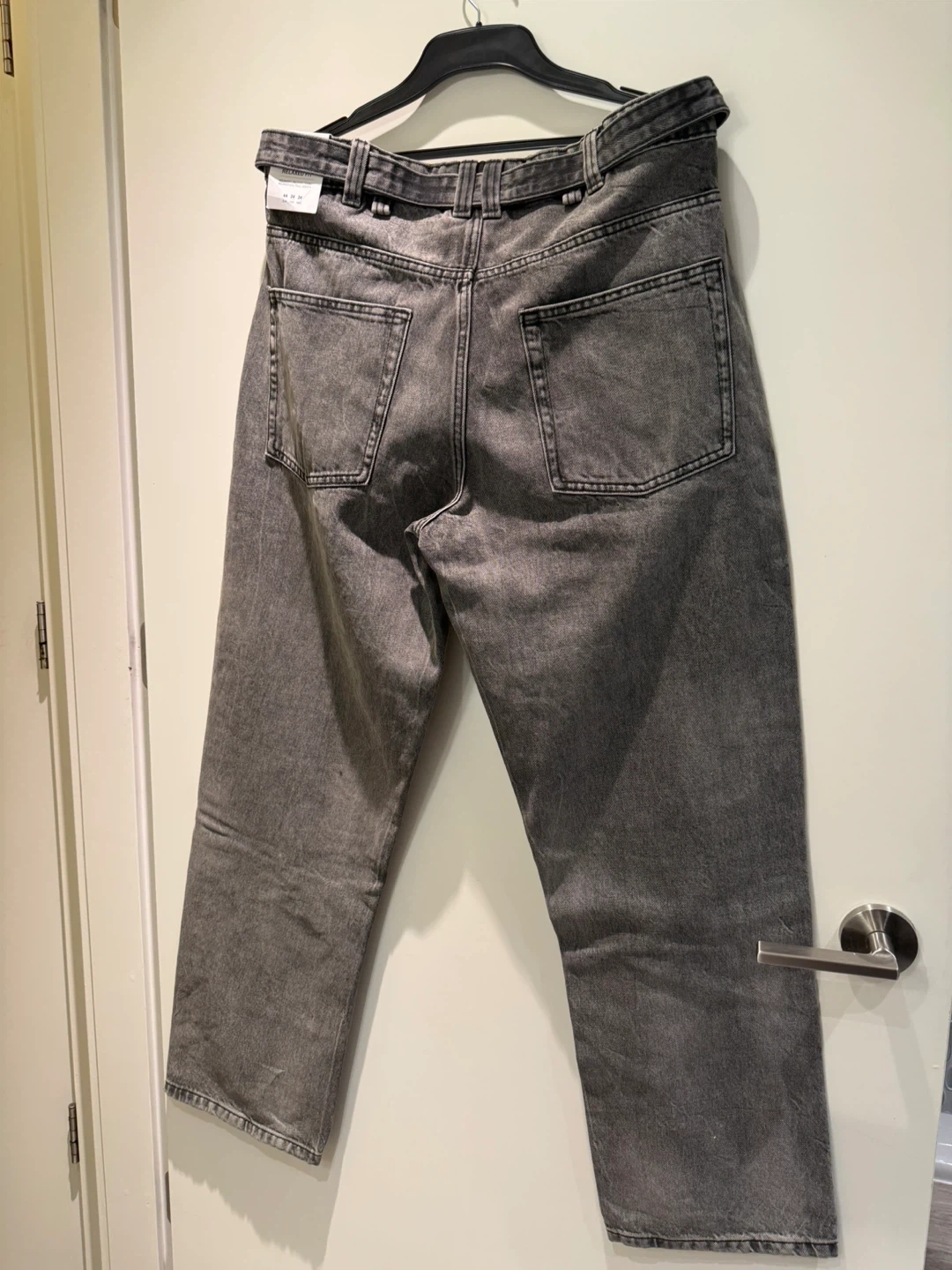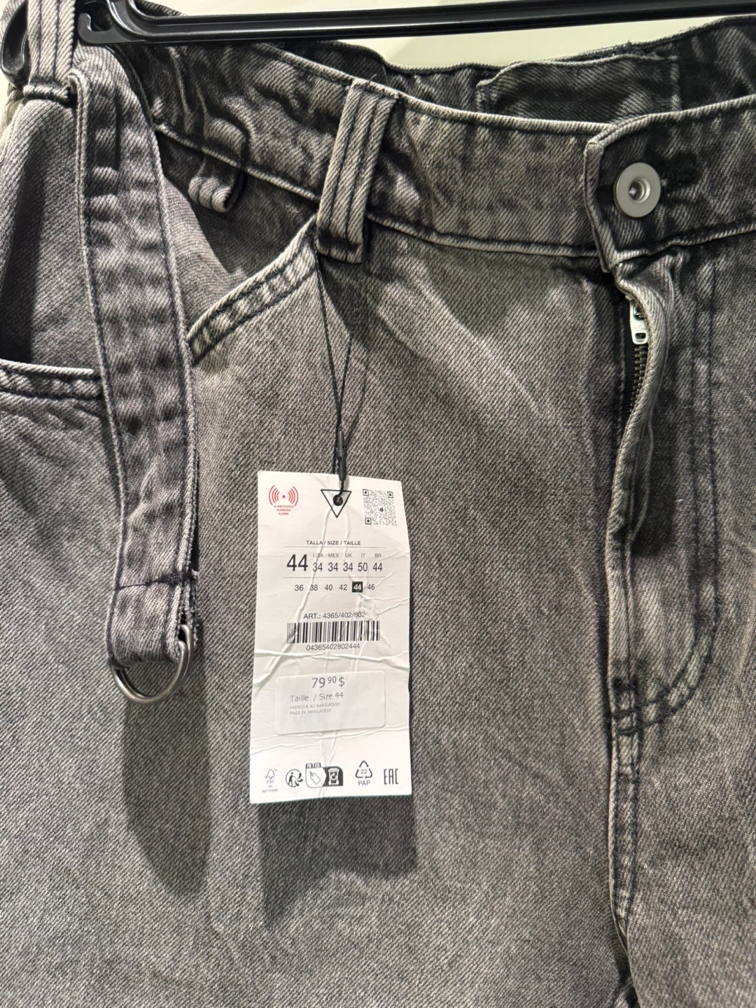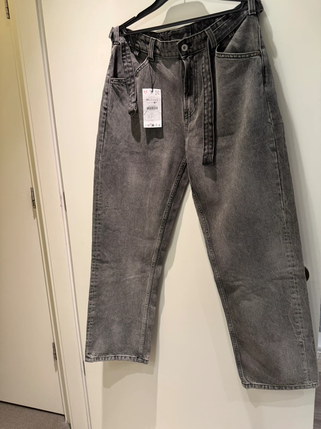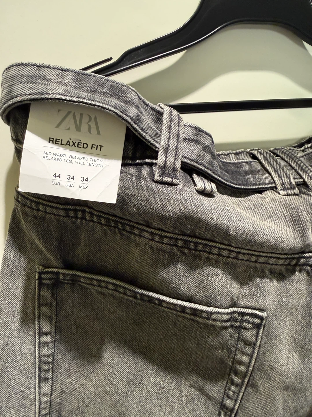 These Zara denim jeans are a relaxed fit with a mid-waist. They're a full length, with a tie belt. Material is denim.