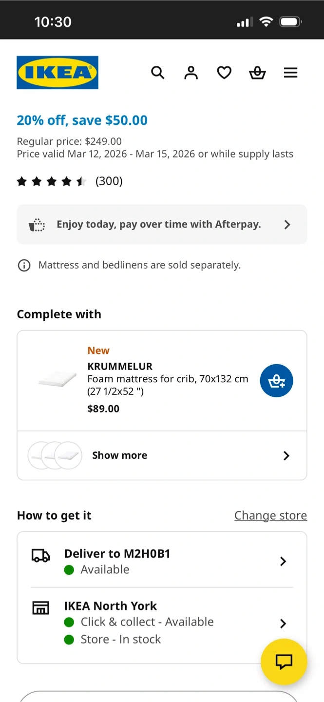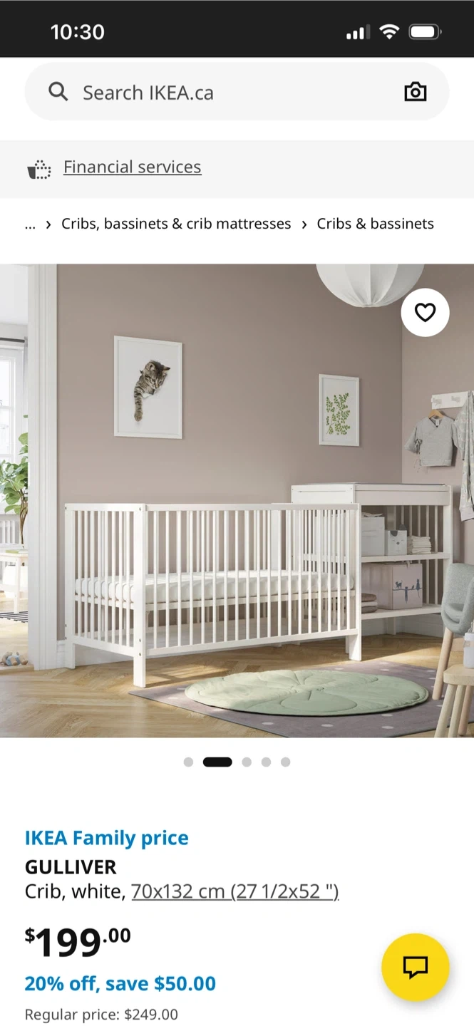This is an IKEA SNIGLAR crib. It's made of beech wood and measures 70x132 cm (27 1/2x52 "). The crib height is 84 cm (33 1/4 "). It comes with mattress.