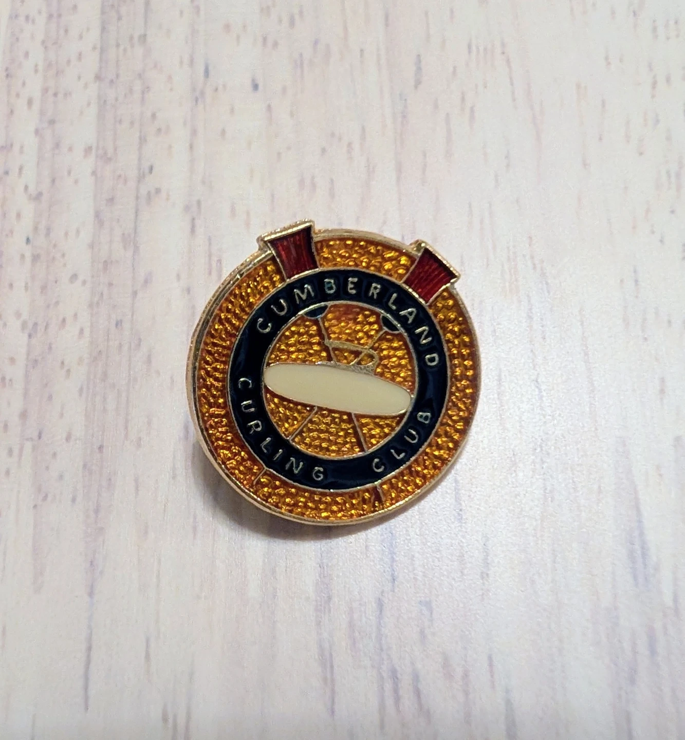 This is a lapel pin for the Cumberland Curling Club. It features a gold-toned rim with textured detailing and a central design of a curling stone and broom. The pin is made of metal with enamel detailing. It's perfect for any curling enthusiast or club member!