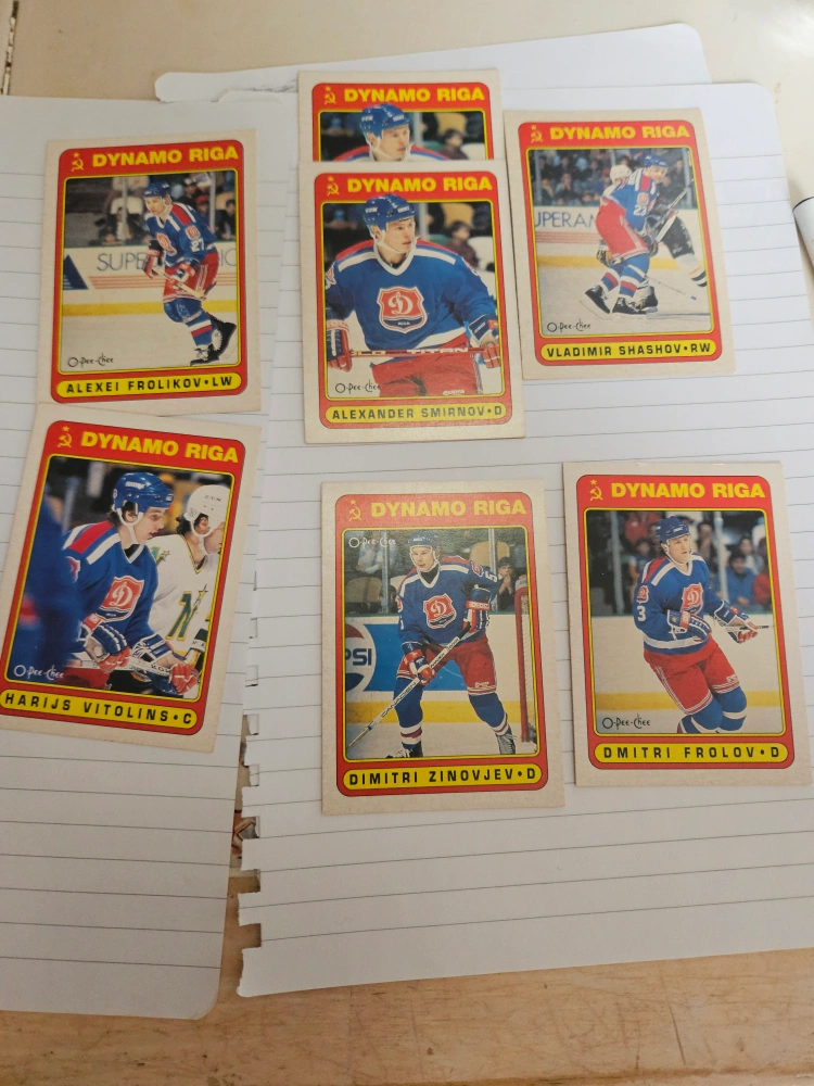 Collection of 20 vintage hockey cards featuring players from Soviet Wings, Central Red Army, and Dynamo Riga teams. Cards show various players in action. Great for collectors.