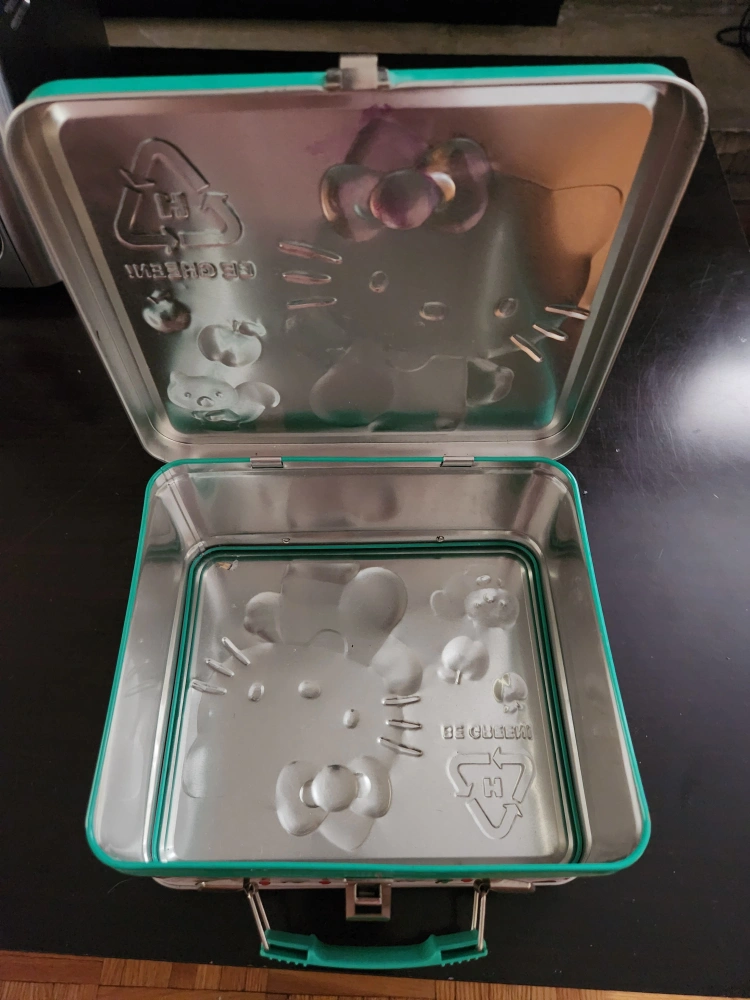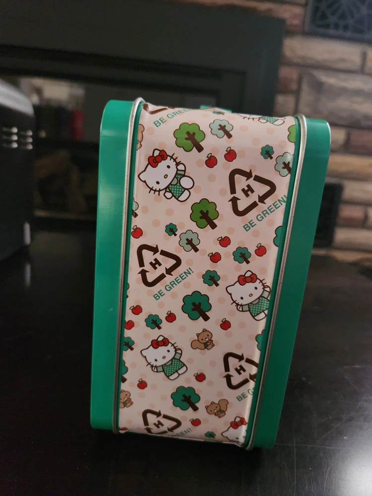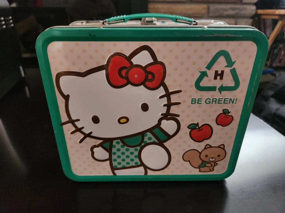 Vintage Hello Kitty lunchbox. Teal green metal exterior. Features Hello Kitty, apples, squirrels, and recycling symbols. Adorable design. Great for collectors or everyday use.
