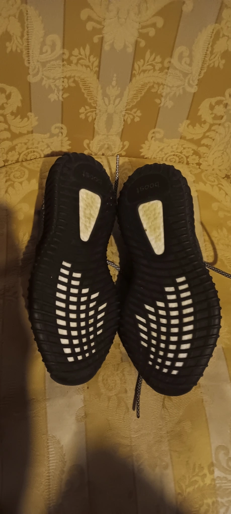 Adidas Yeezy Boost 350 V2 sneakers. Gray and black knit upper. Red stripe detail. Boost sole. Good condition. Size shown in image.