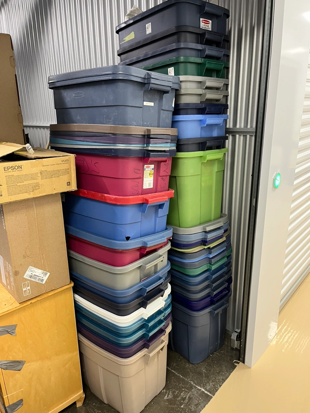Large quantity of various-sized plastic storage containers. 24 in total. Multiple colours available. Great for moving, organizing, or storage. All Rubbermaid.