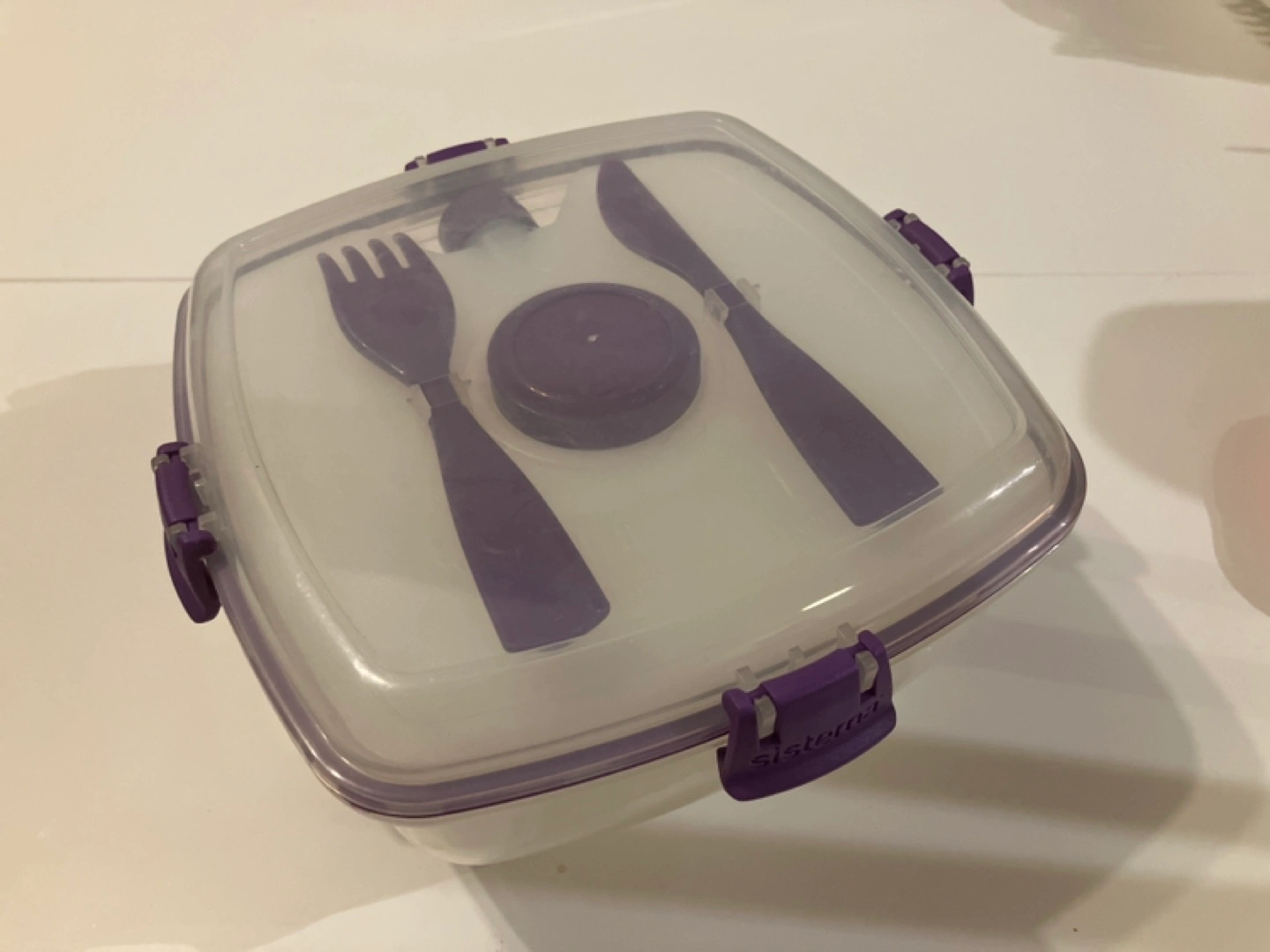 Sistema brand salad container. Includes a separate dressing container and built-in cutlery, refillable ice pack. Size 1.63L/ 55oz. Great for keeping your salad chill.