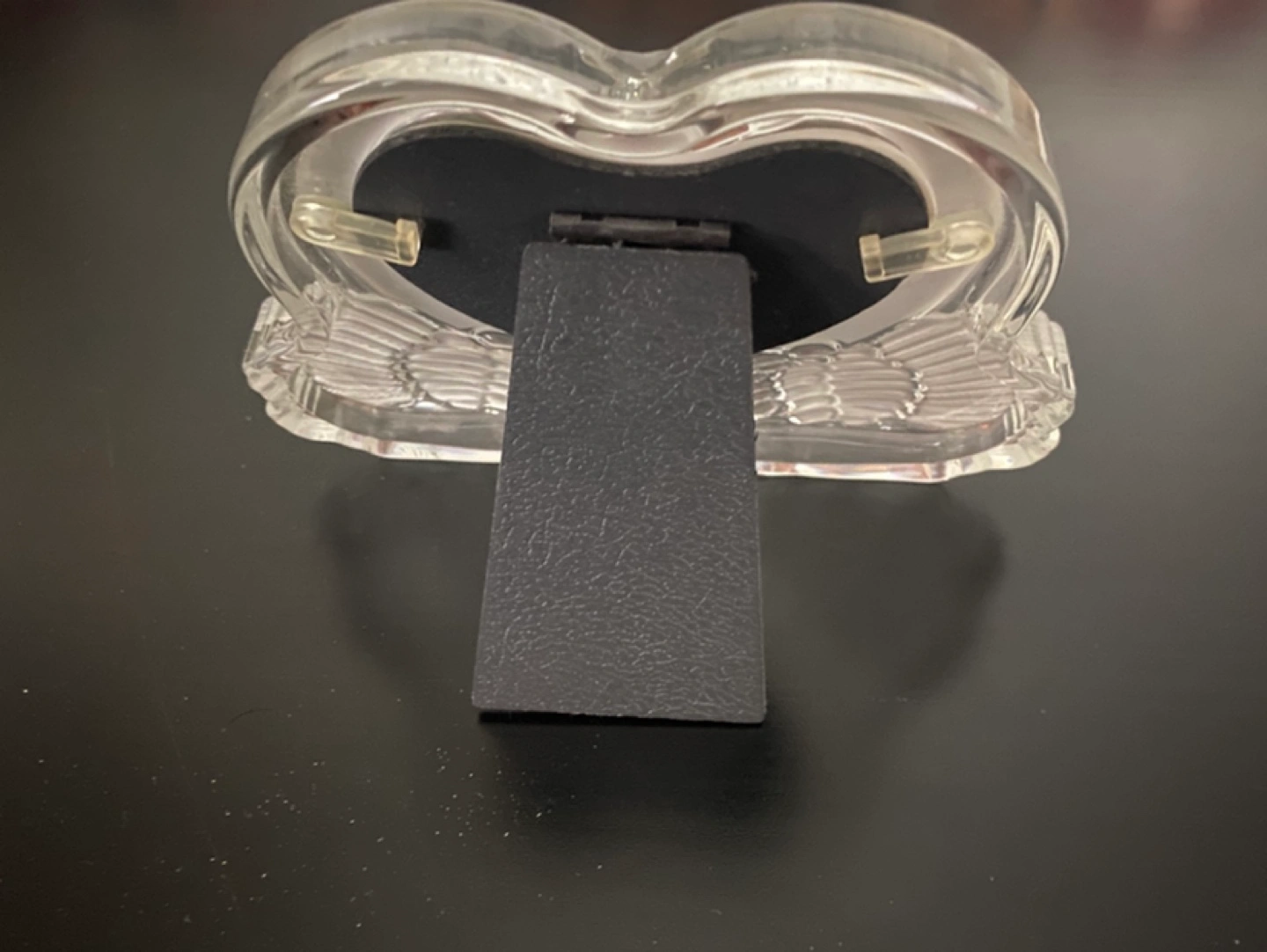 Lovely heart-shaped crystal photo frame. Features two swans. Elegant design of 2 swans coming together forming a heart.