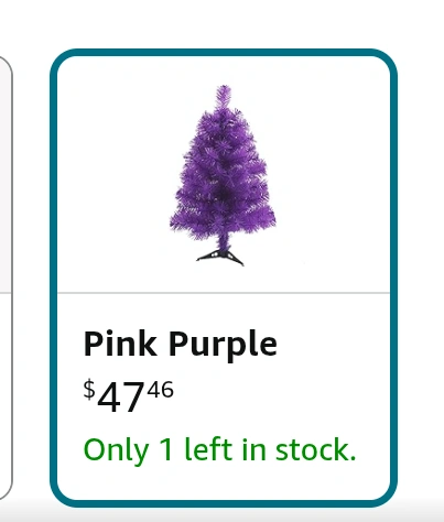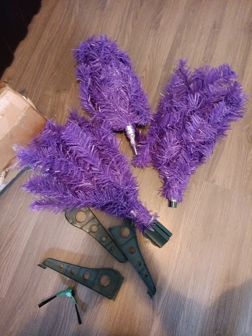 Three small purple artificial Christmas trees. Perfect for tabletop decor. Includes bases. Pre-owned, but in good condition.