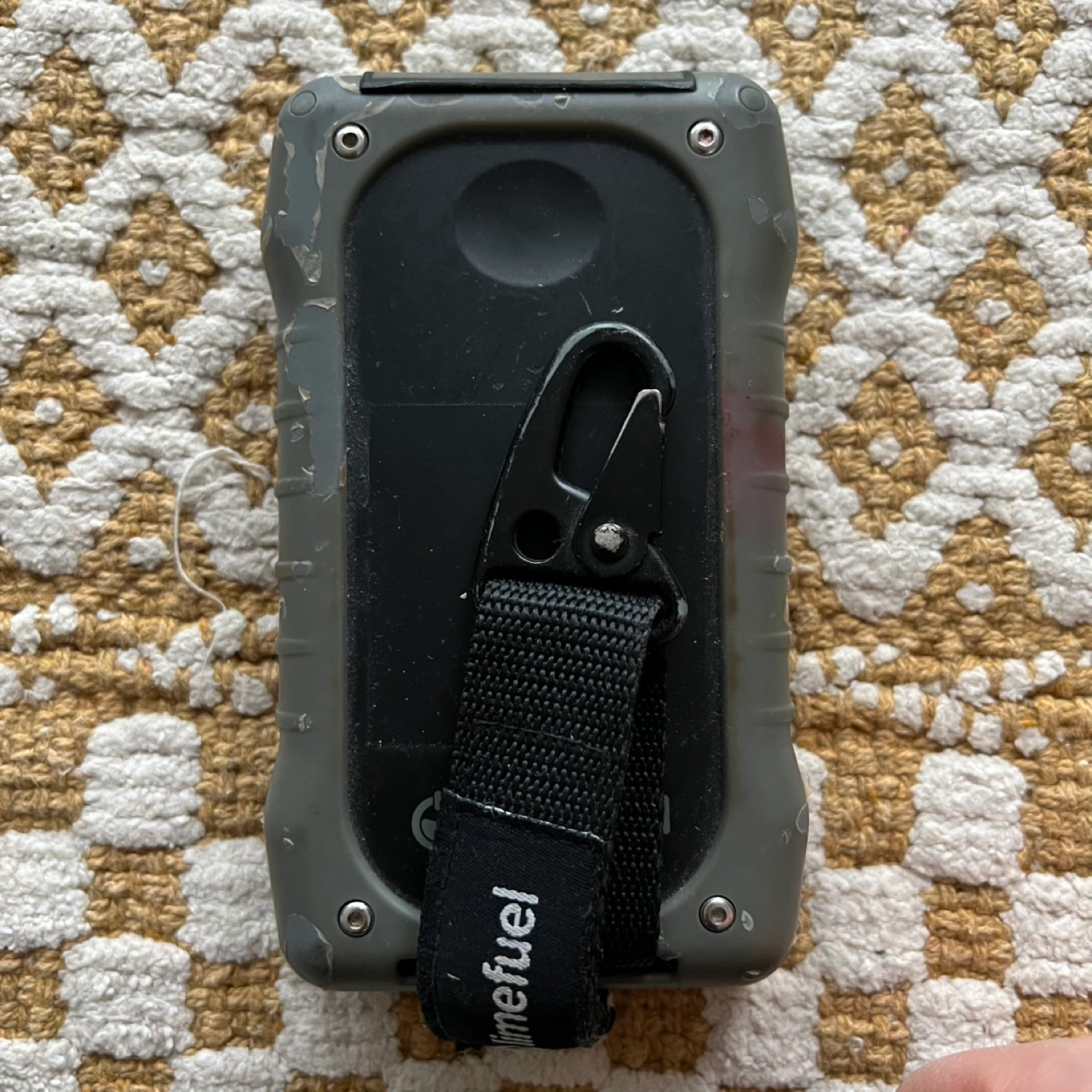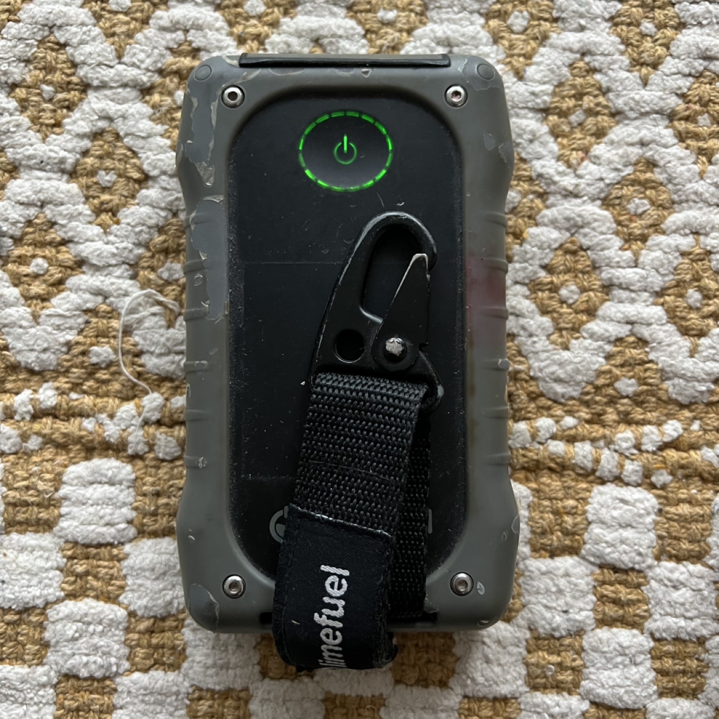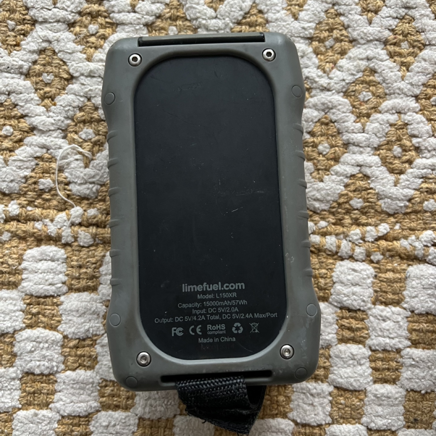 Pre-owned Limefuel L150XR portable power bank. Grey casing. Features a carabiner clip. Shows some wear.