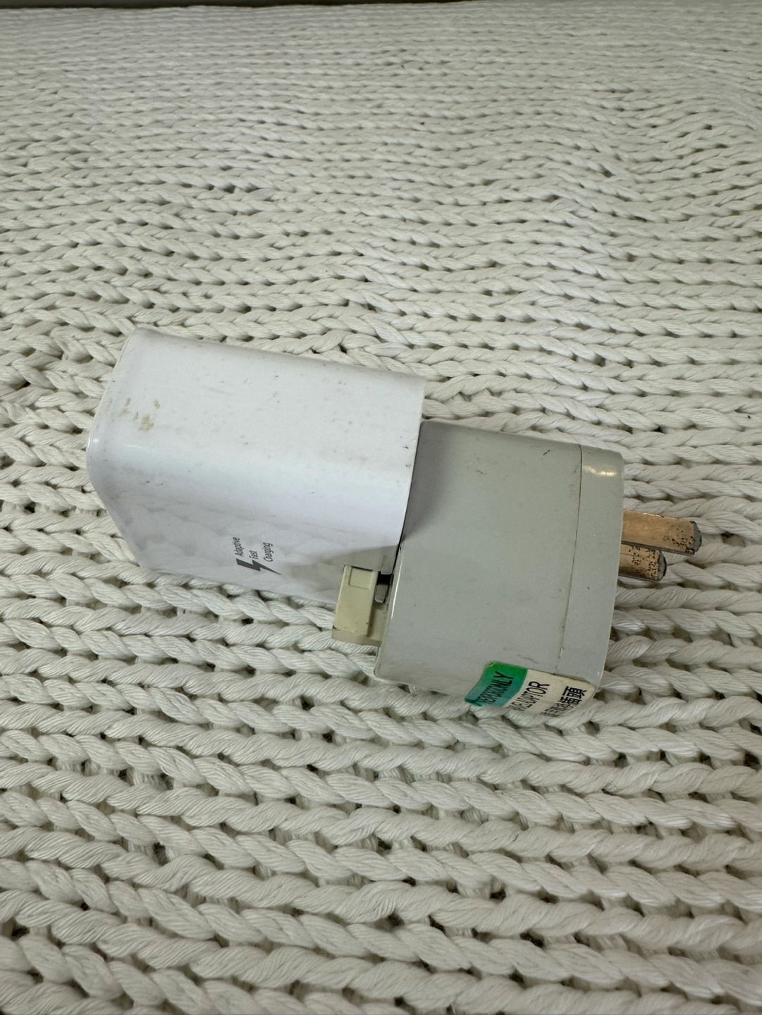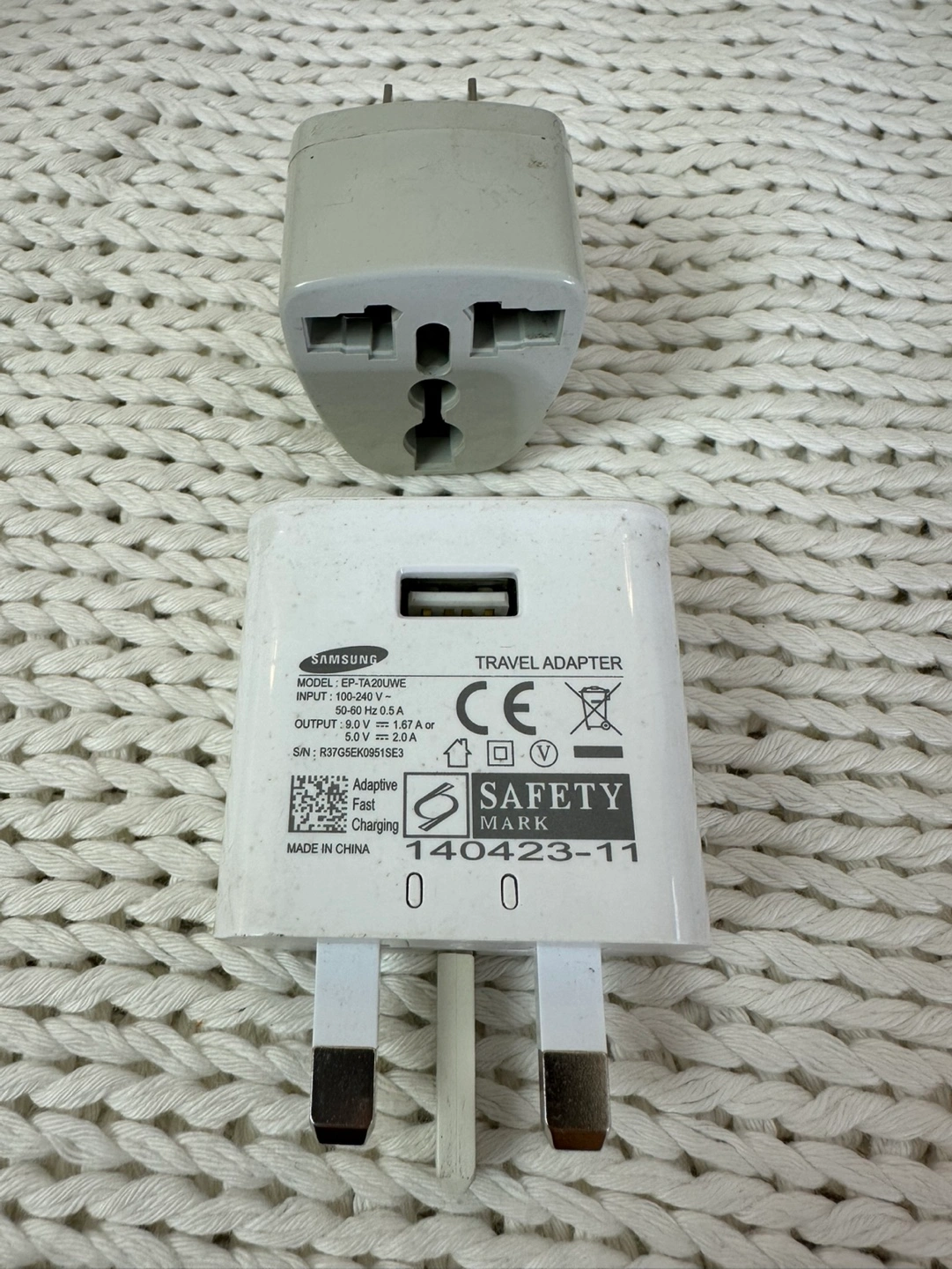 White Samsung travel adapter. Includes UK plug (w/ locking mechanism) and US adapter. Adaptive Fast Charging. Model EP-TA20UWE. Made in China.