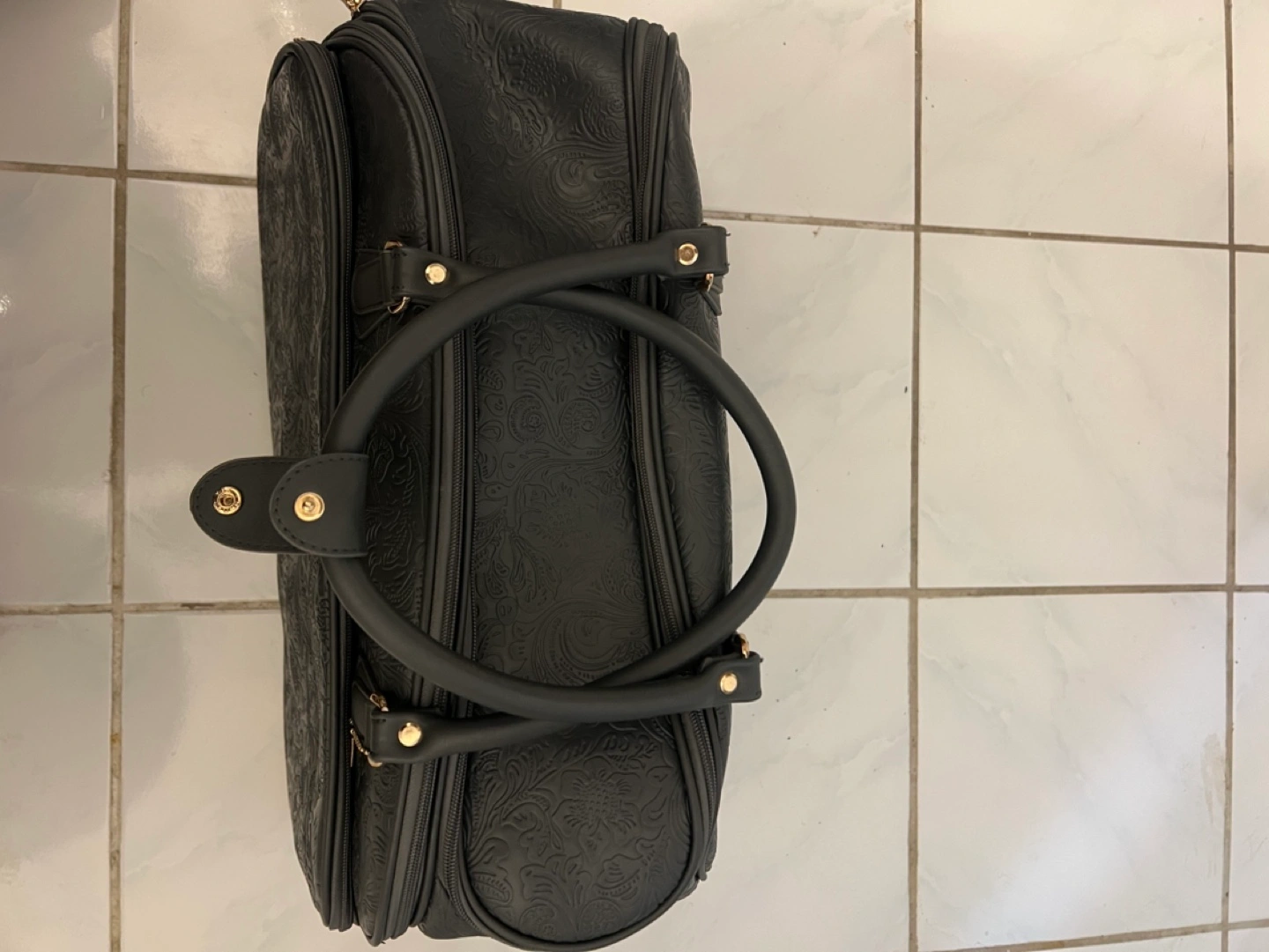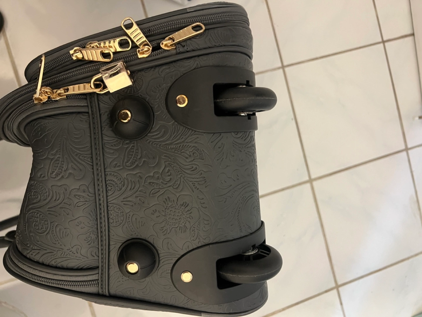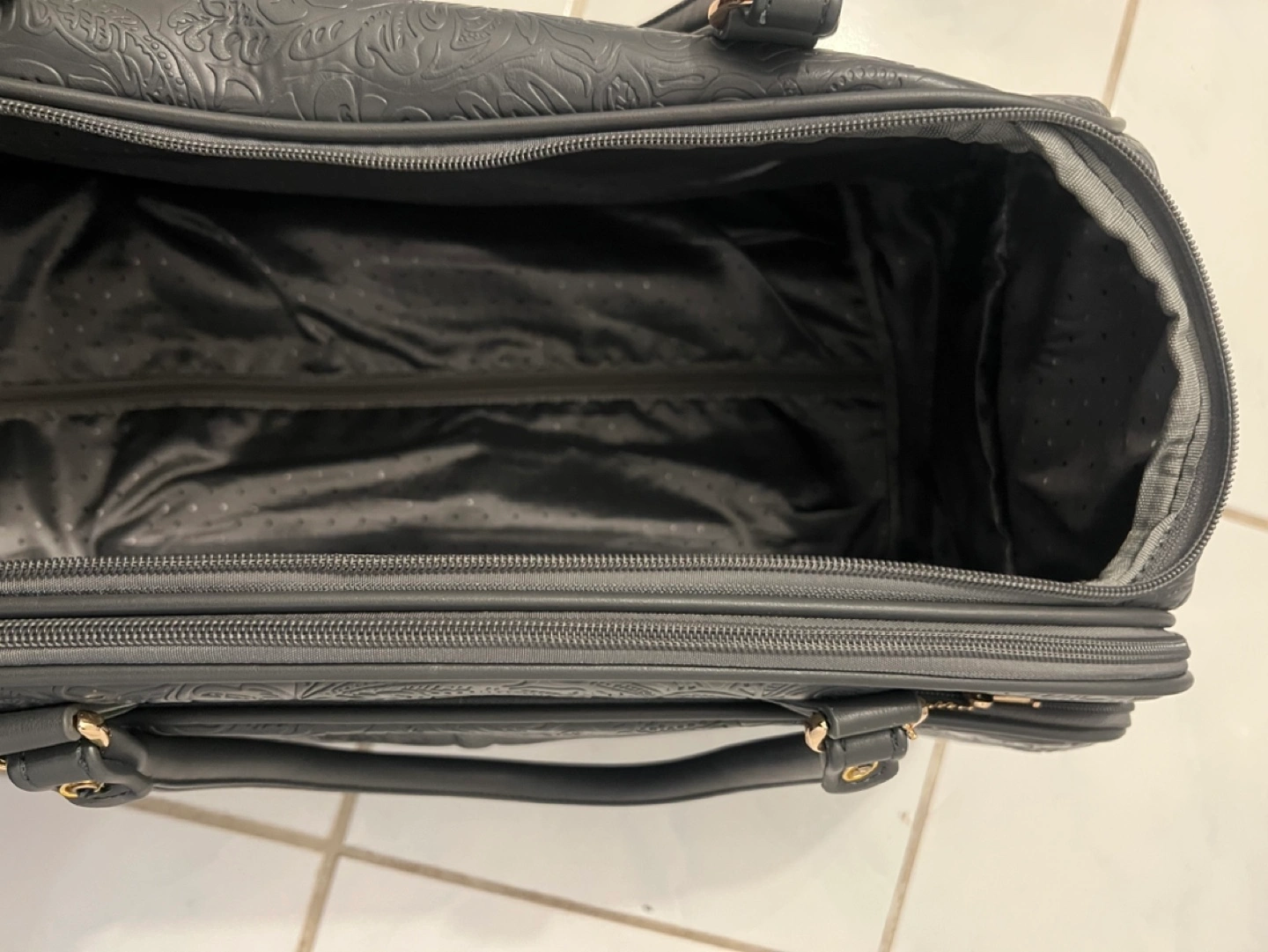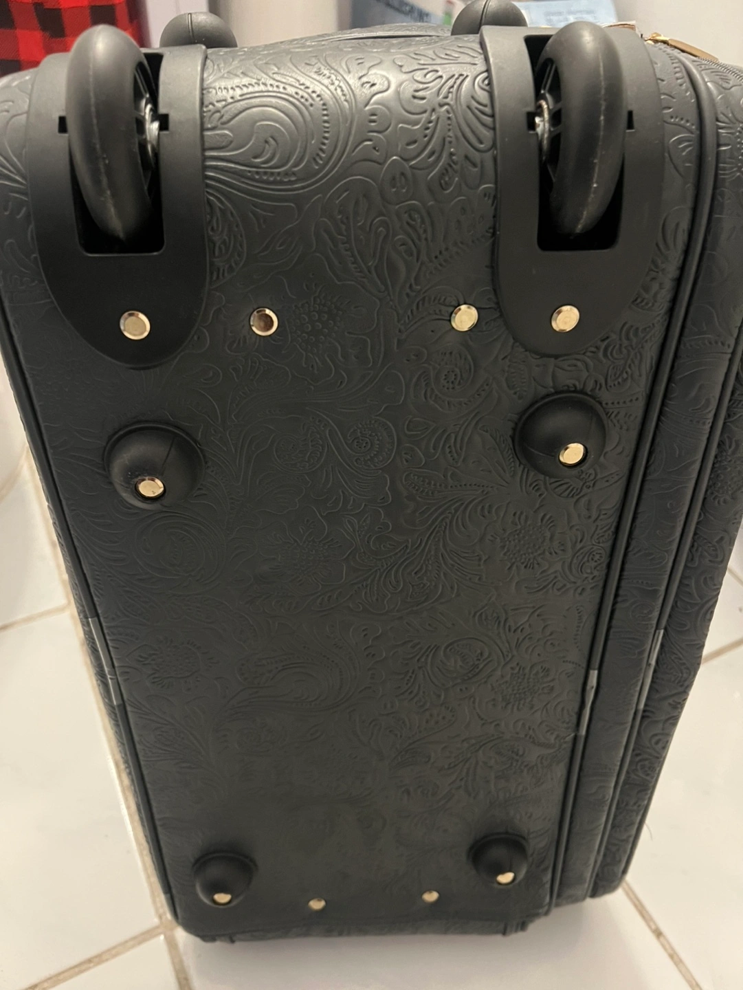 Black rolling suitcase. Embossed floral pattern. Three compartments. Features a telescopic handle and two spinner wheels. TSA-approved lock. Gold accents.