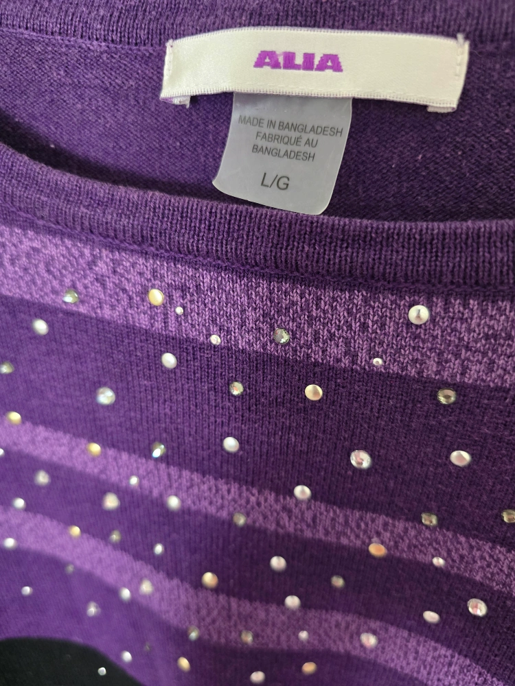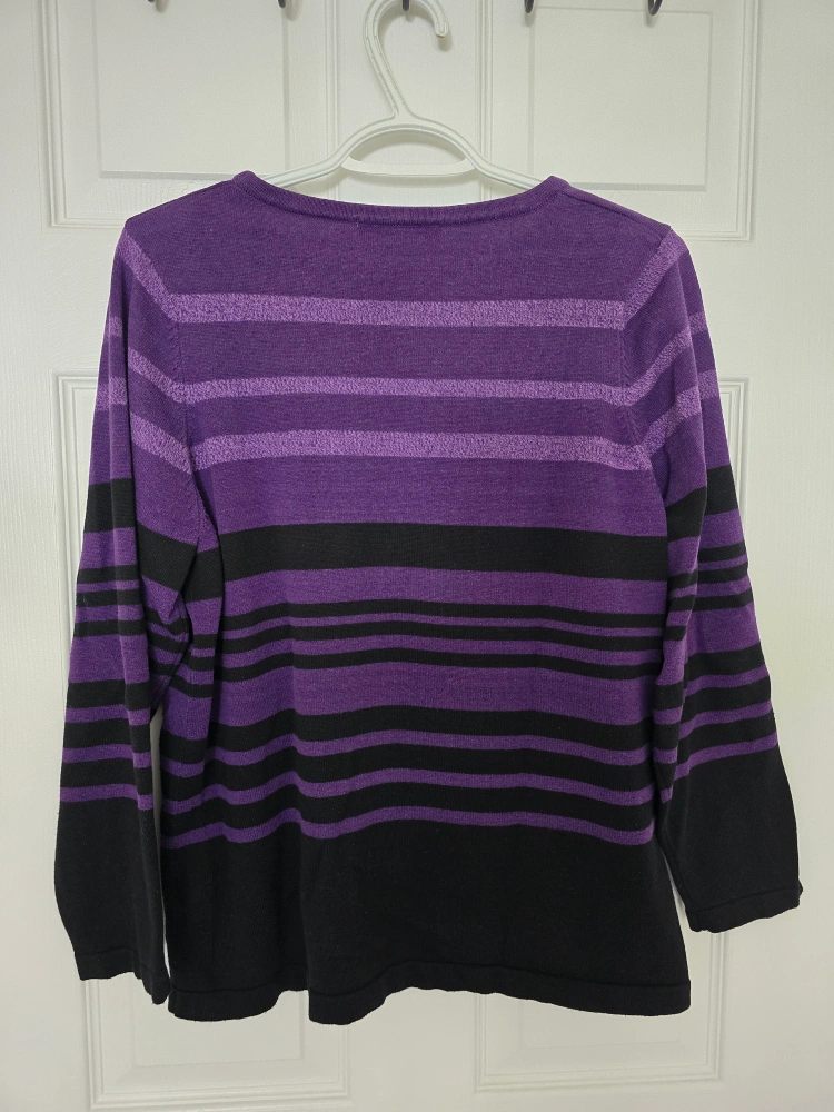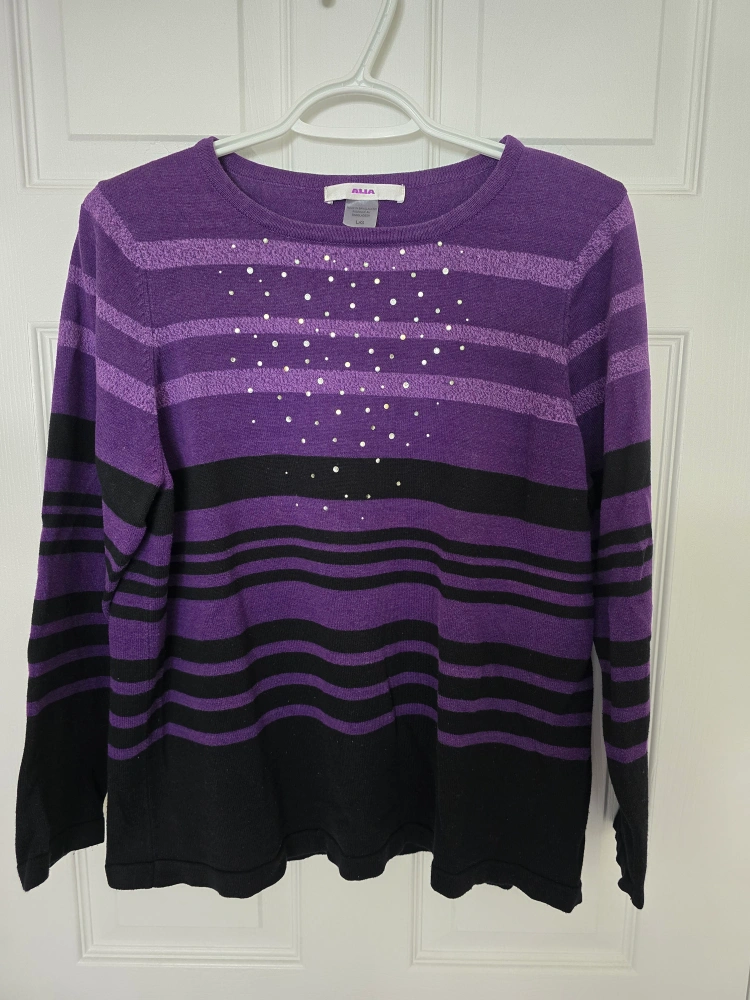 Women's long-sleeved sweater. Purple and black horizontal stripes. Rhinestone detail on the chest. Size L/G. Made in Bangladesh. smoke and pet free home