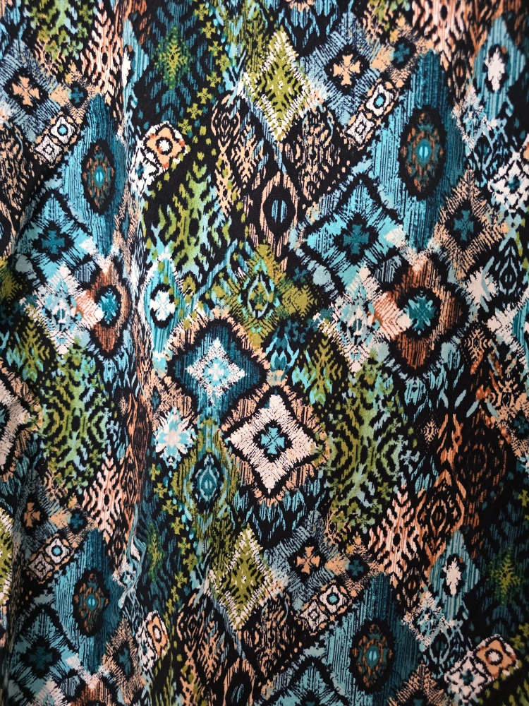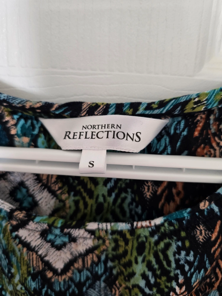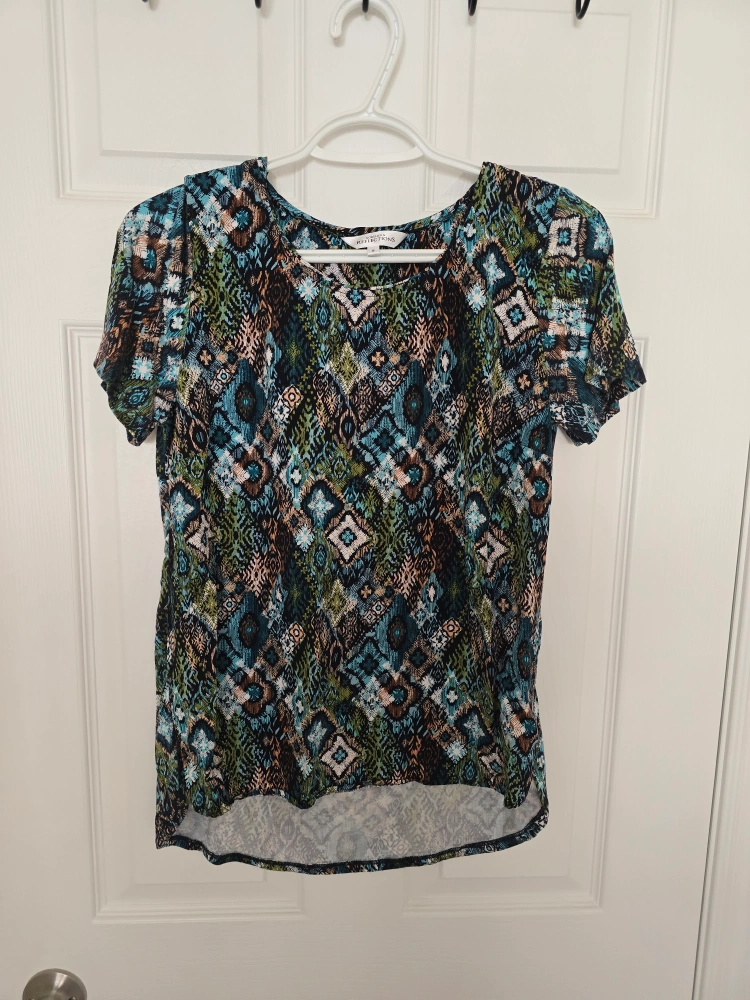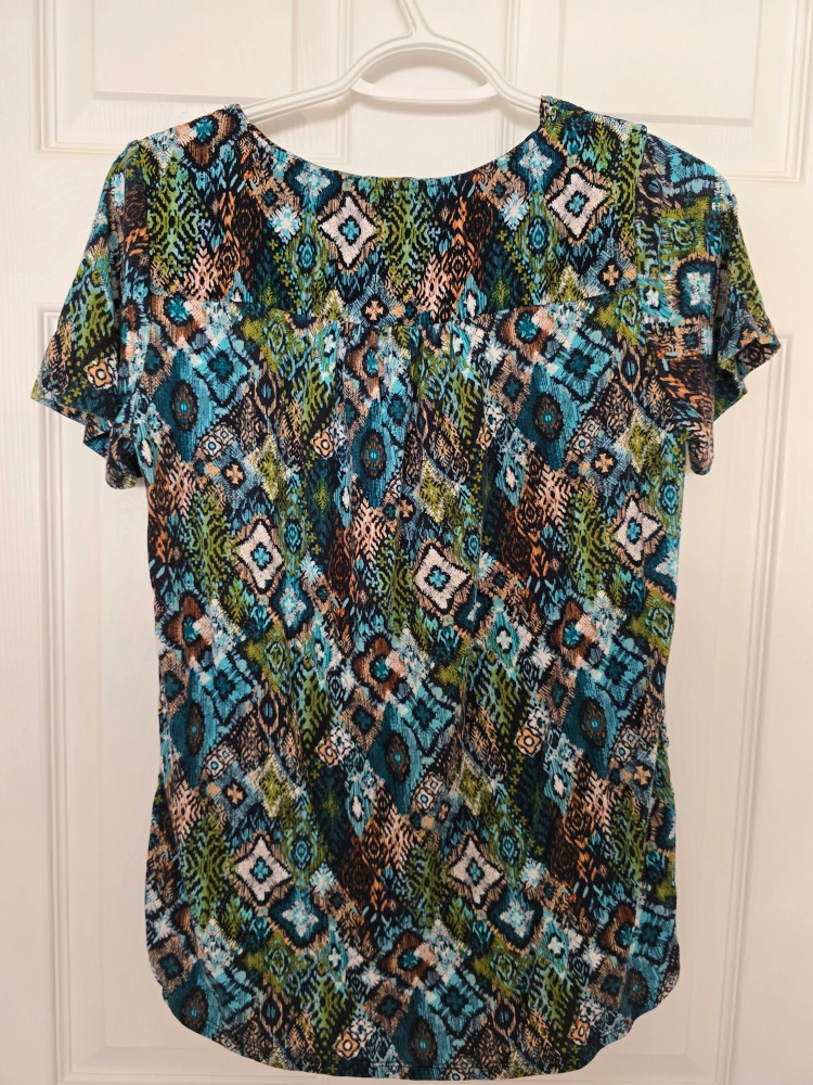 Short sleeve, patterned blouse. Size small. Teal, green, brown, and white colours. Geometric print. smoke and pet free home