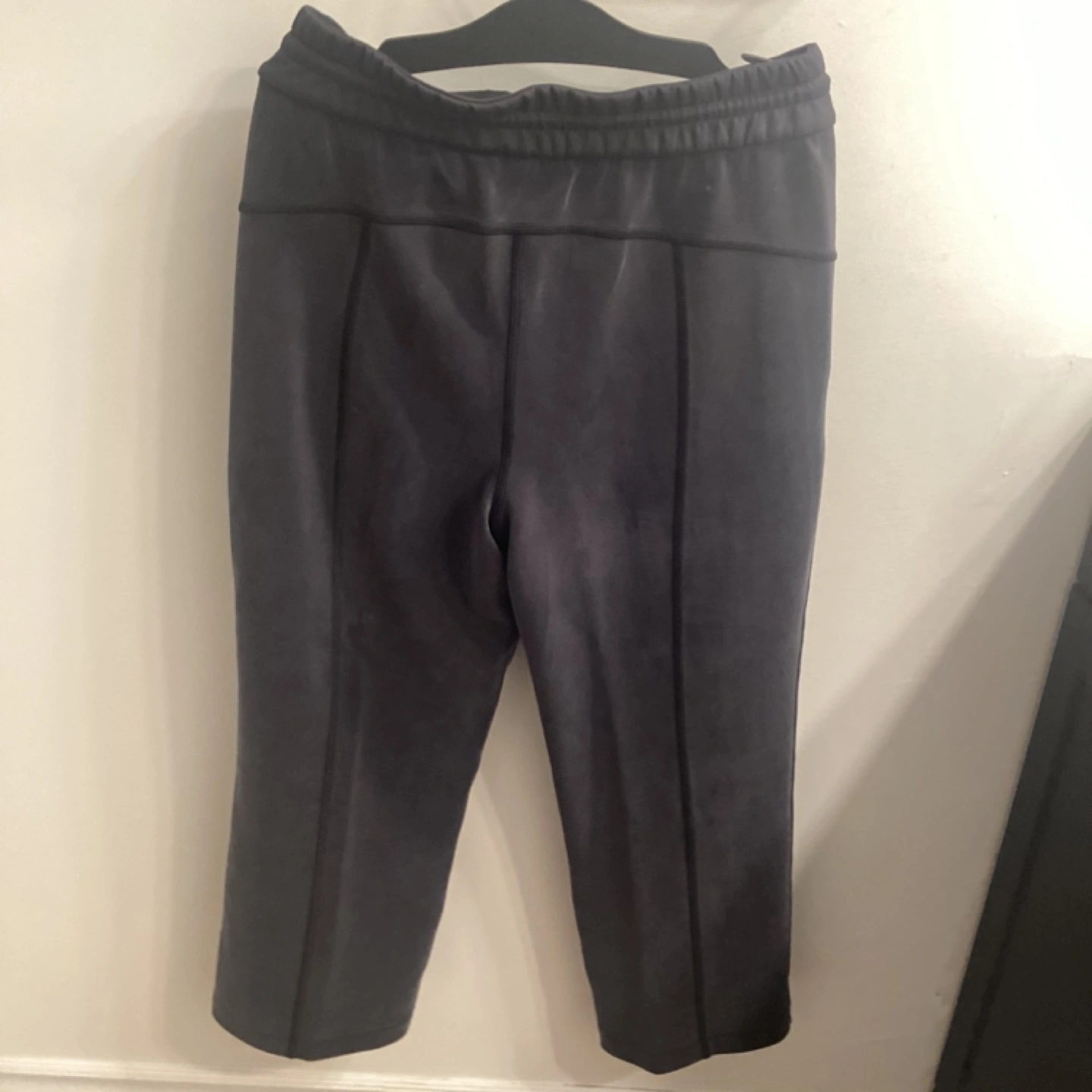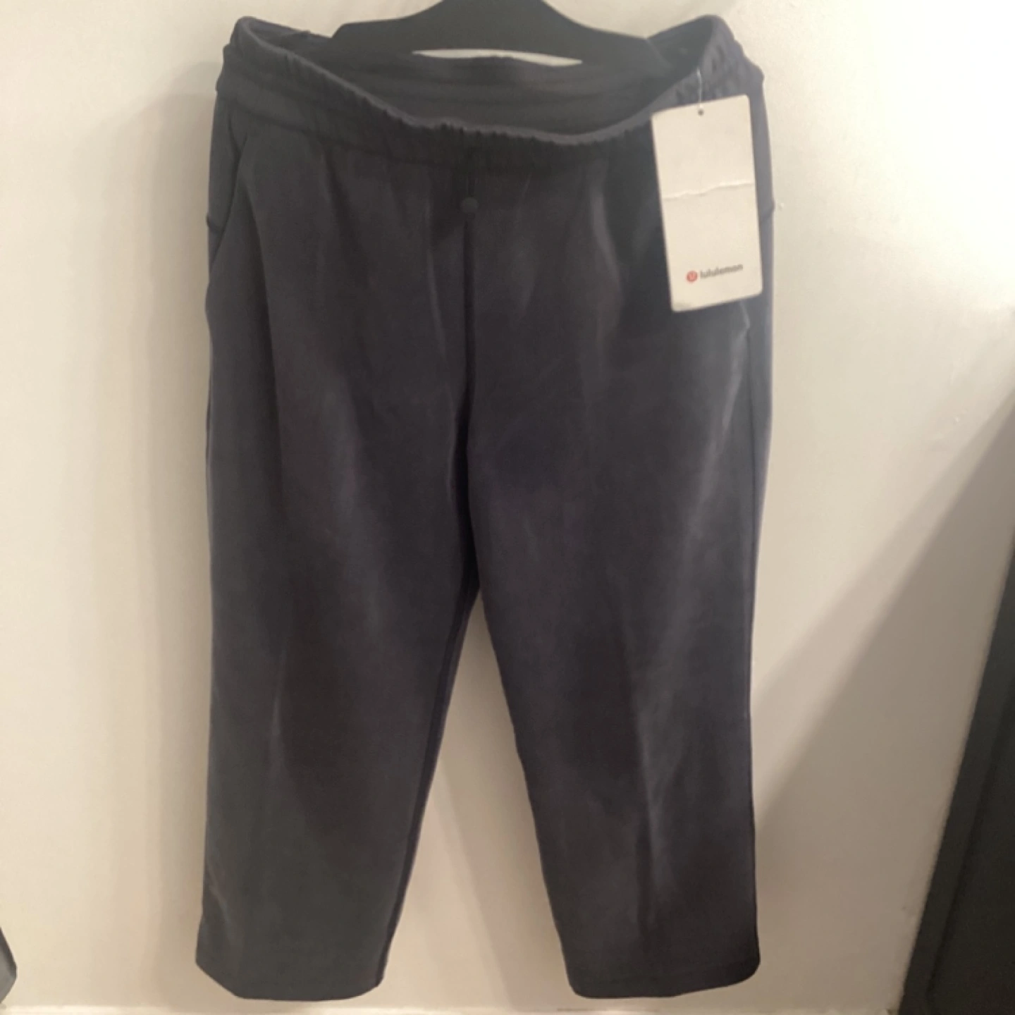 Size 6. Dark grey. New with tags. High rise, 24" length. Soft, four-way stretch fabric. Features pockets and a drawstring waist. Recycled materials.