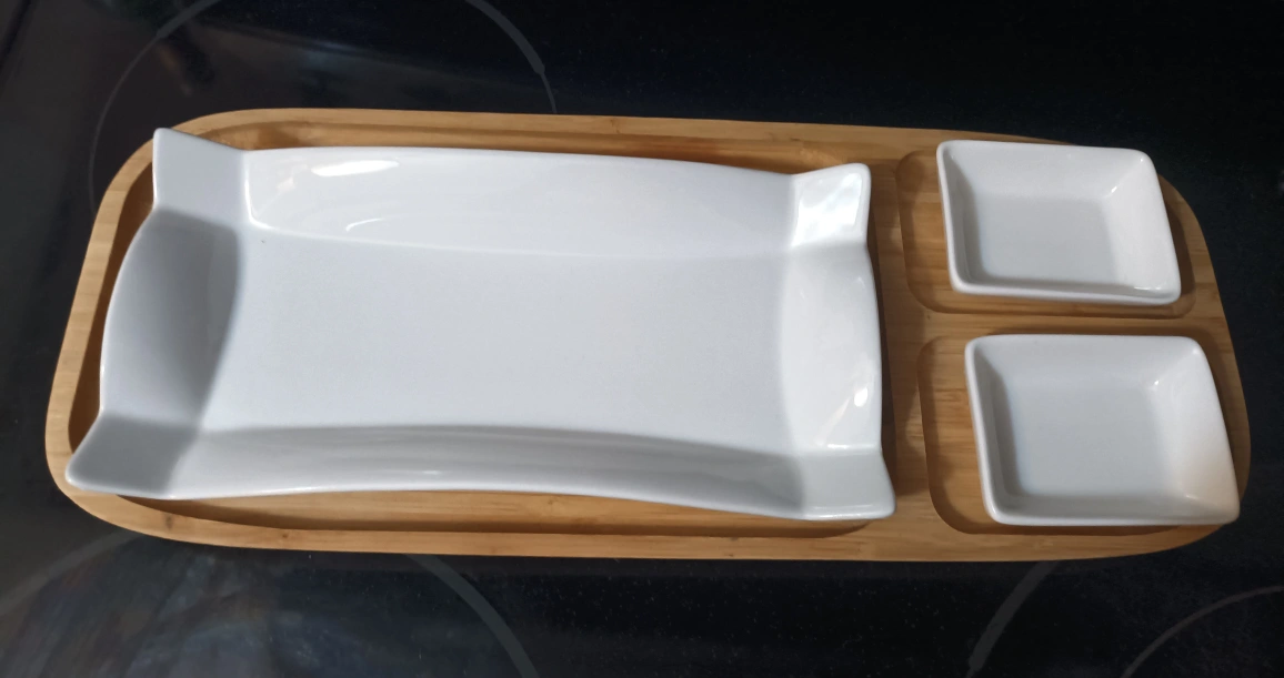 Elegant serving tray. Features a large rectangular dish and two smaller square dishes. Bamboo construction. Perfect for appetizers or snacks.