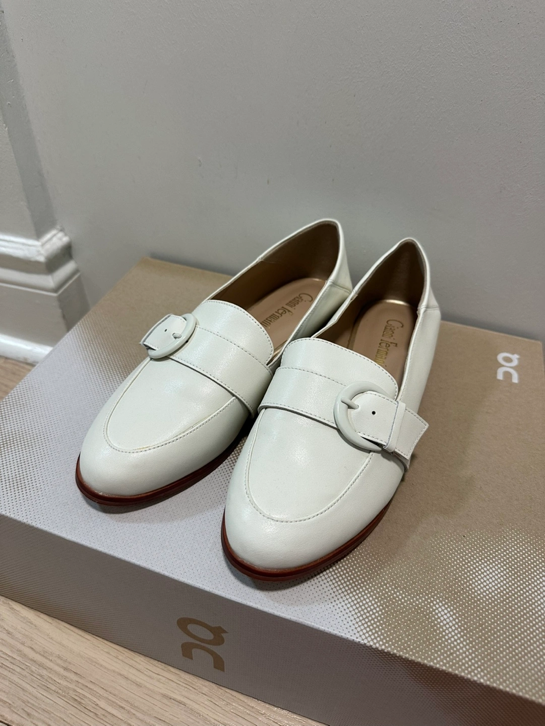 Women's off-white leather loafers. Single buckle detail. Slip-on style. Brand new.