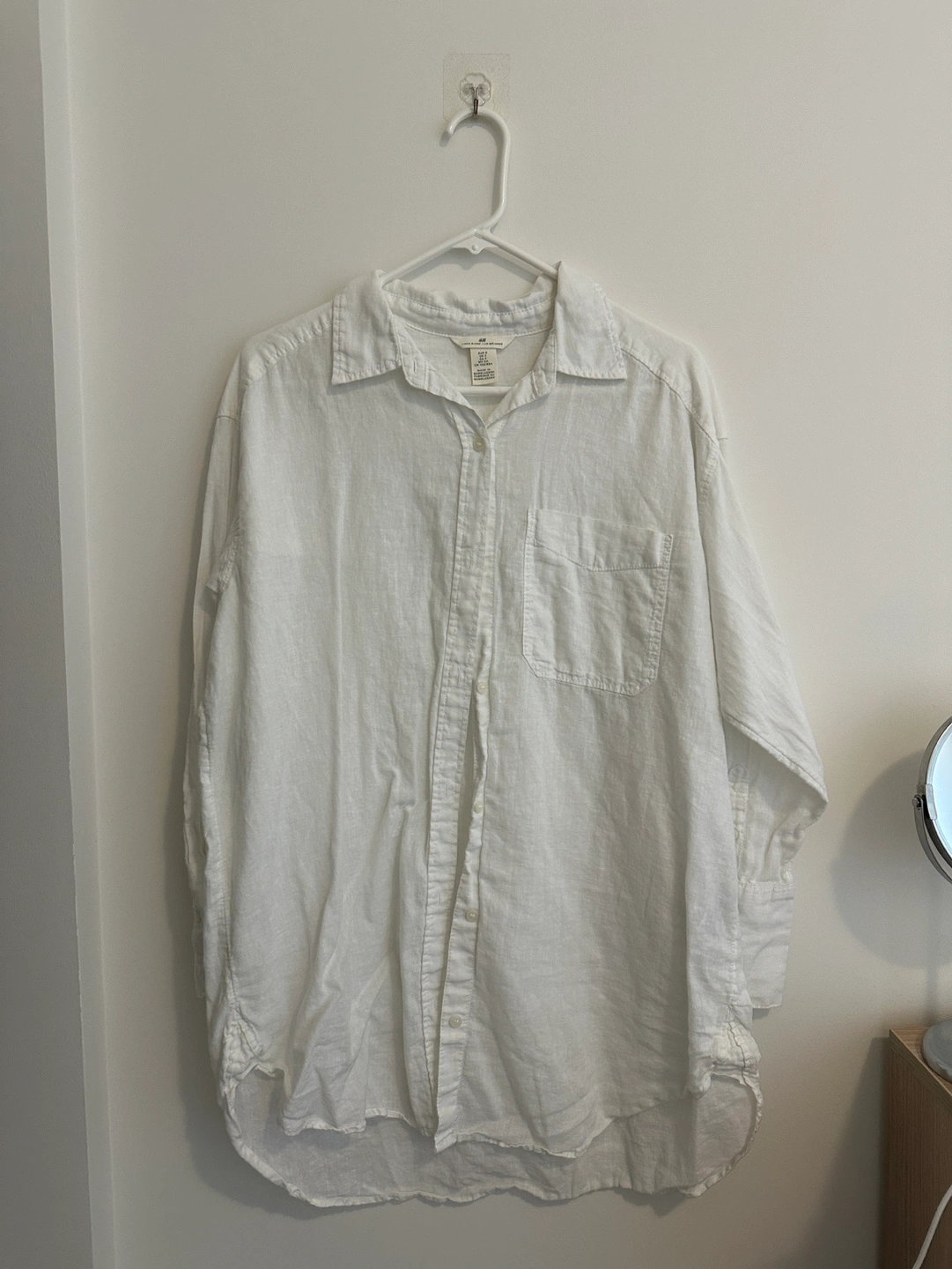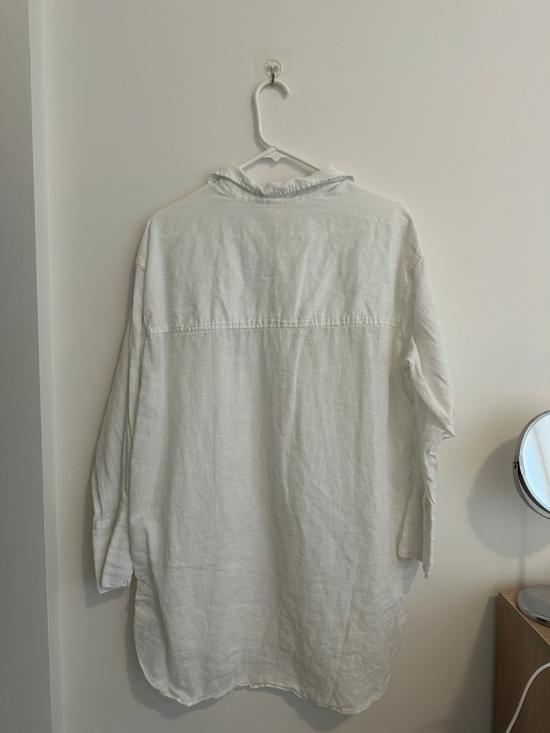 Oversized white linen button-up shirt. Long sleeves, curved hem. One chest pocket.