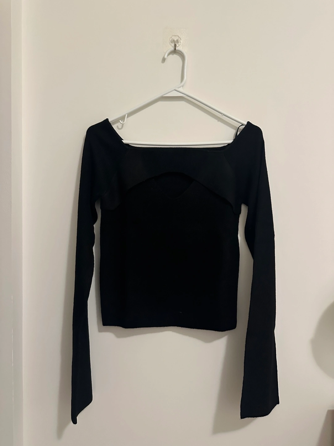 Black ribbed knit crop top. Off-the-shoulder design. Long sleeves. Slight bell shape at the sleeve cuffs. Cut-out detail at the neckline. Excellent condition - never worn.