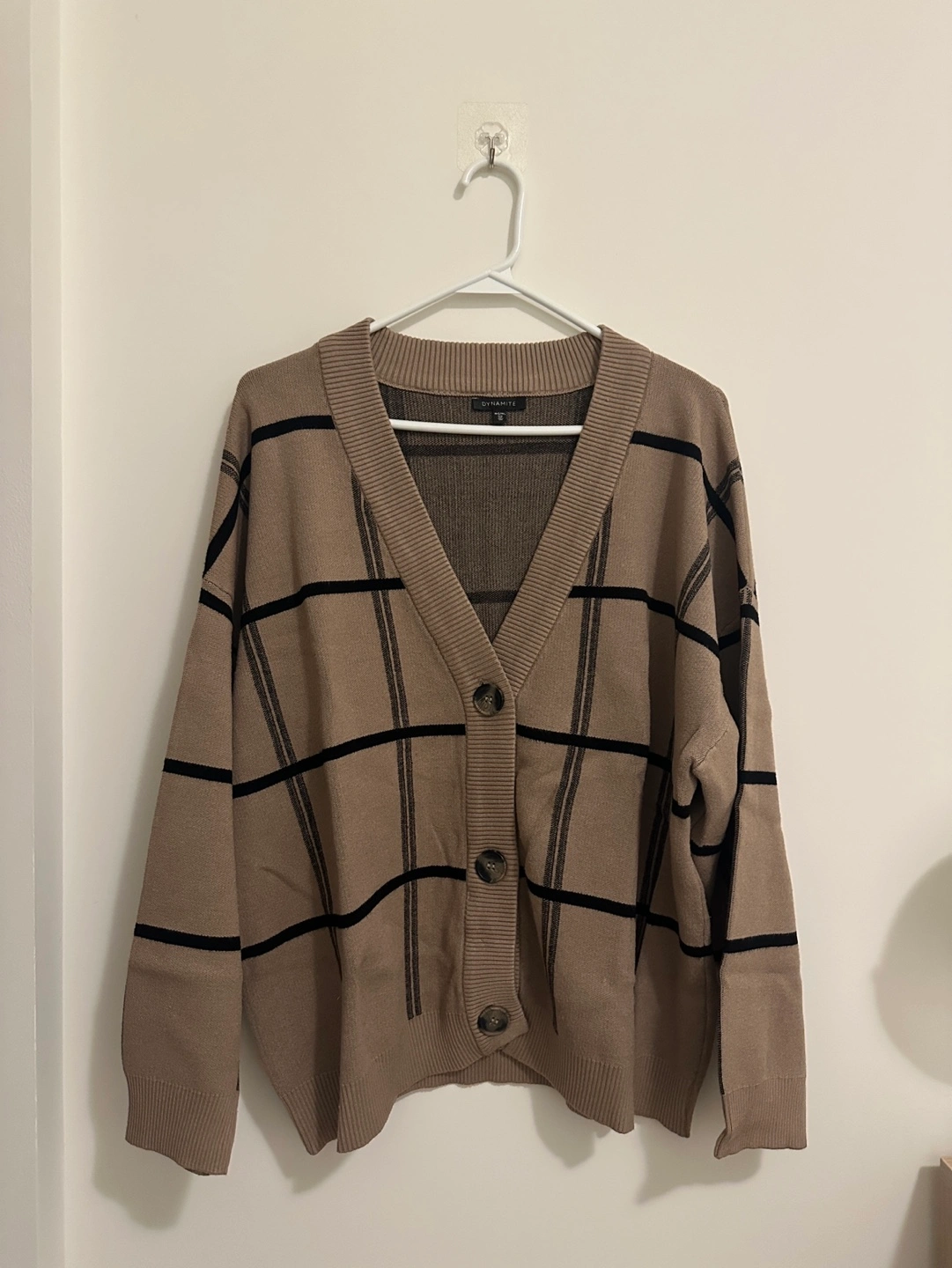Cozy oversized cardigan. Features a V-neck, button closure, and a relaxed fit. Brown and black checked pattern. Perfect for layering.