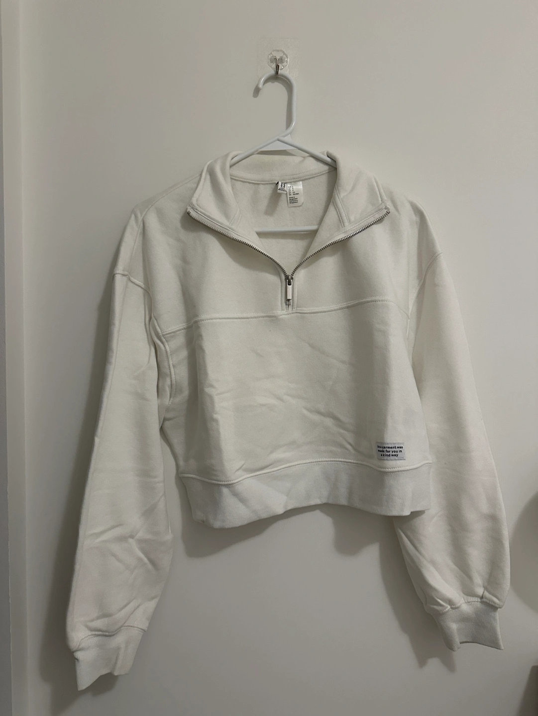 Women's cropped quarter-zip sweatshirt. White colour. Long sleeves. Soft material. Relaxed fit.