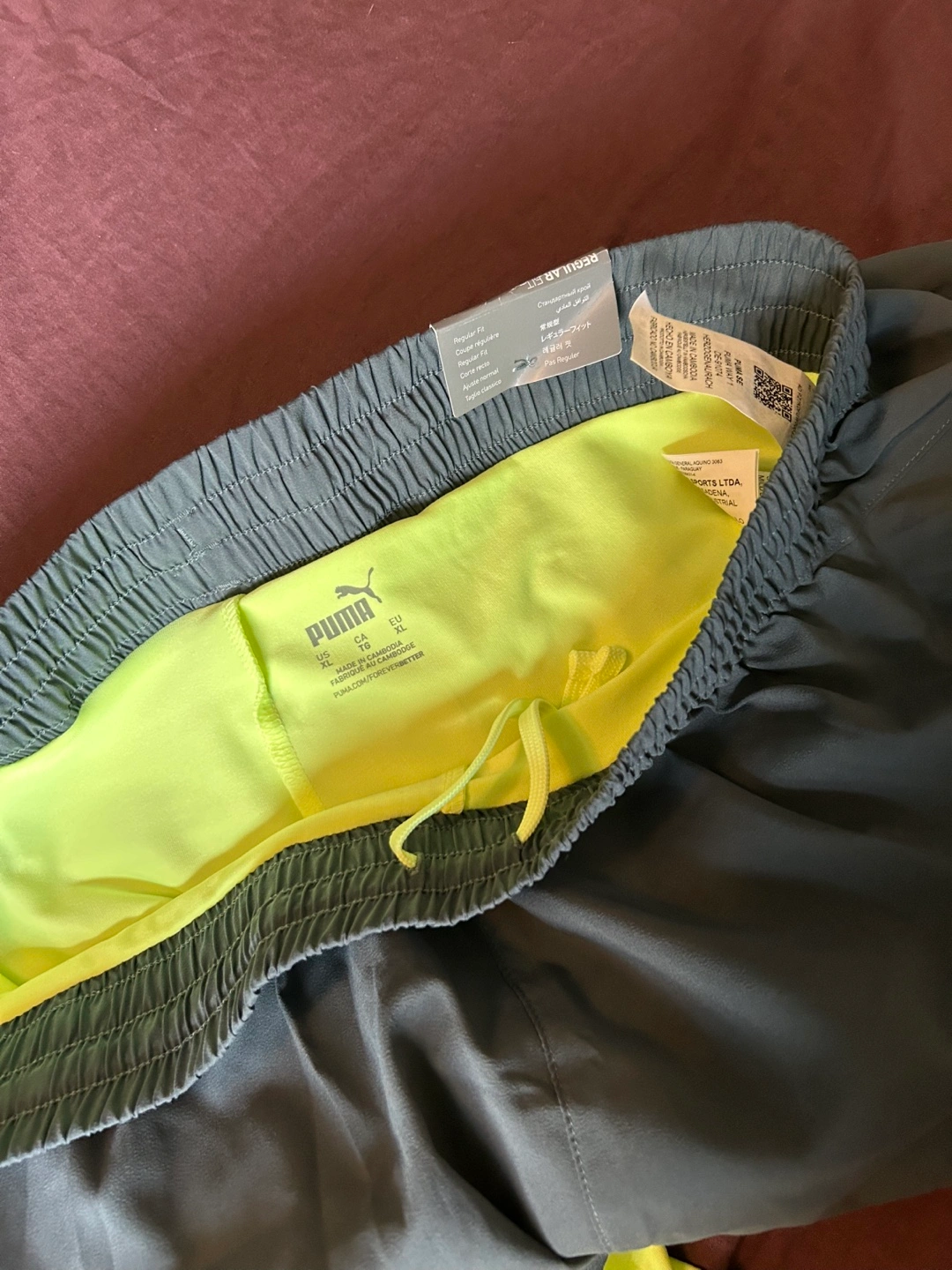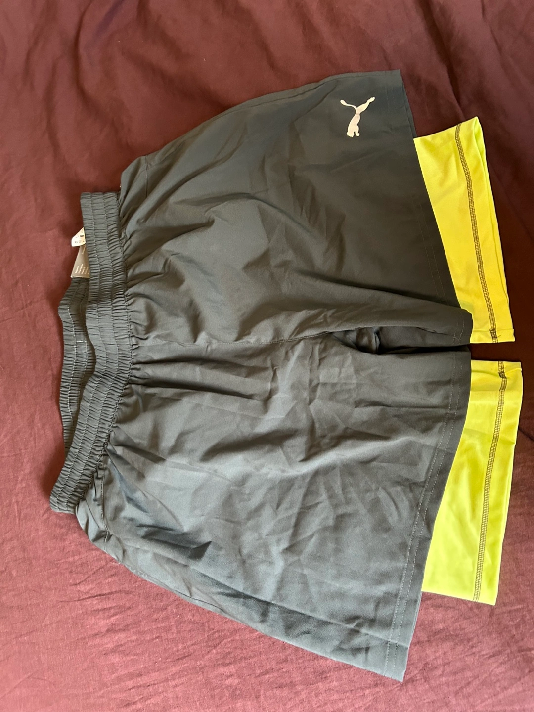 Men's athletic shorts. Grey with neon yellow accents. Regular fit. Size large. Drawstring waist.