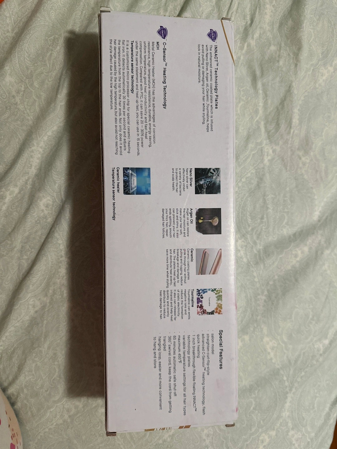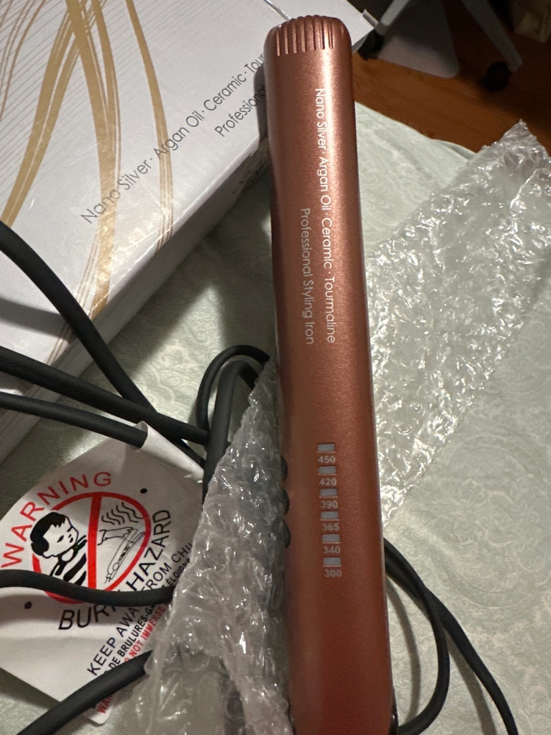 Rose gold. Professional styling iron. Features nano silver, argan oil, and tourmaline. Includes a power cord. Temperature adjustable