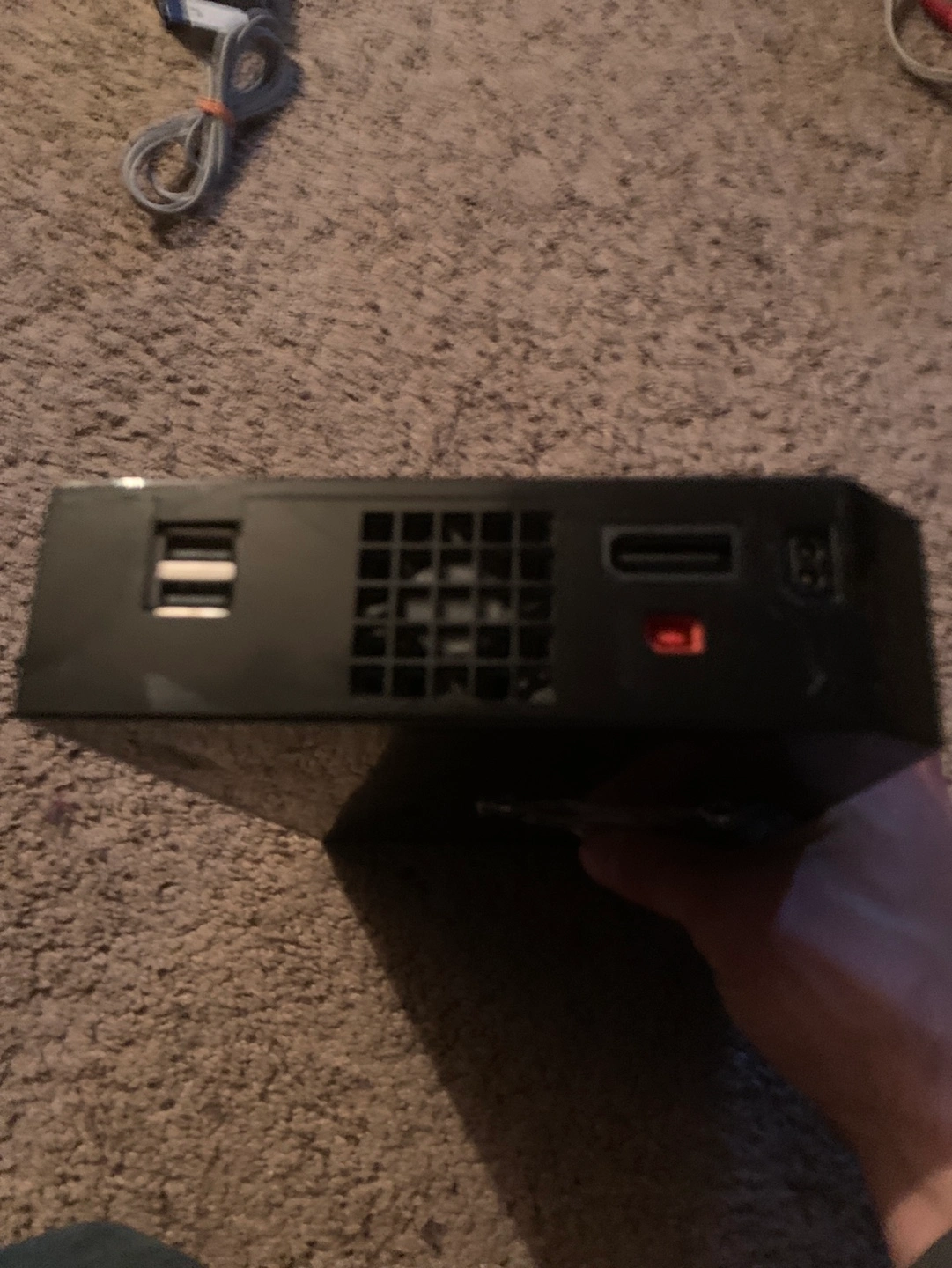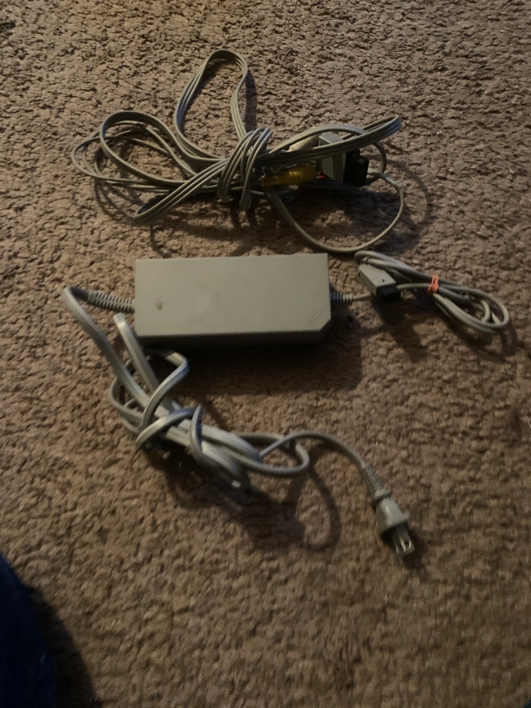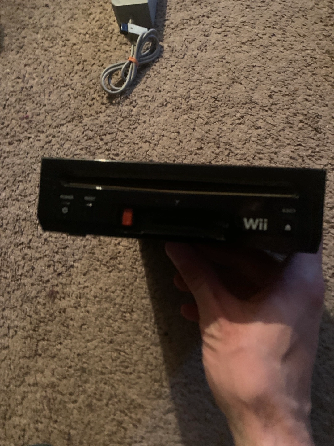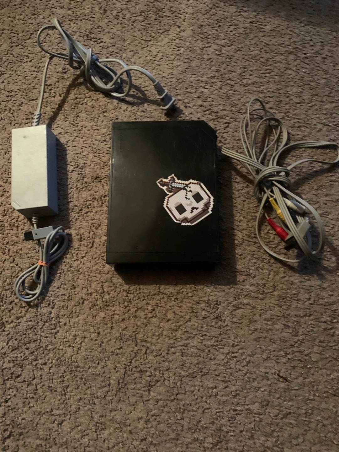 Black Wii console. Includes power supply and AV cables. Pre-owned, some wear and tear. Sticker on top. Also I found the sensor bar and a controller