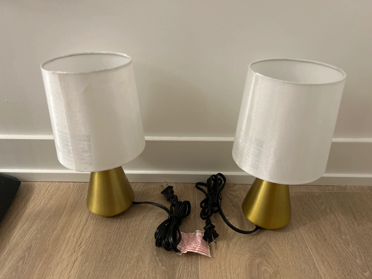 Set of two small table lamps. Gold-coloured base and white fabric shades. Electric plug included. Perfect for bedside tables or a small space. One for $13 , two for $20