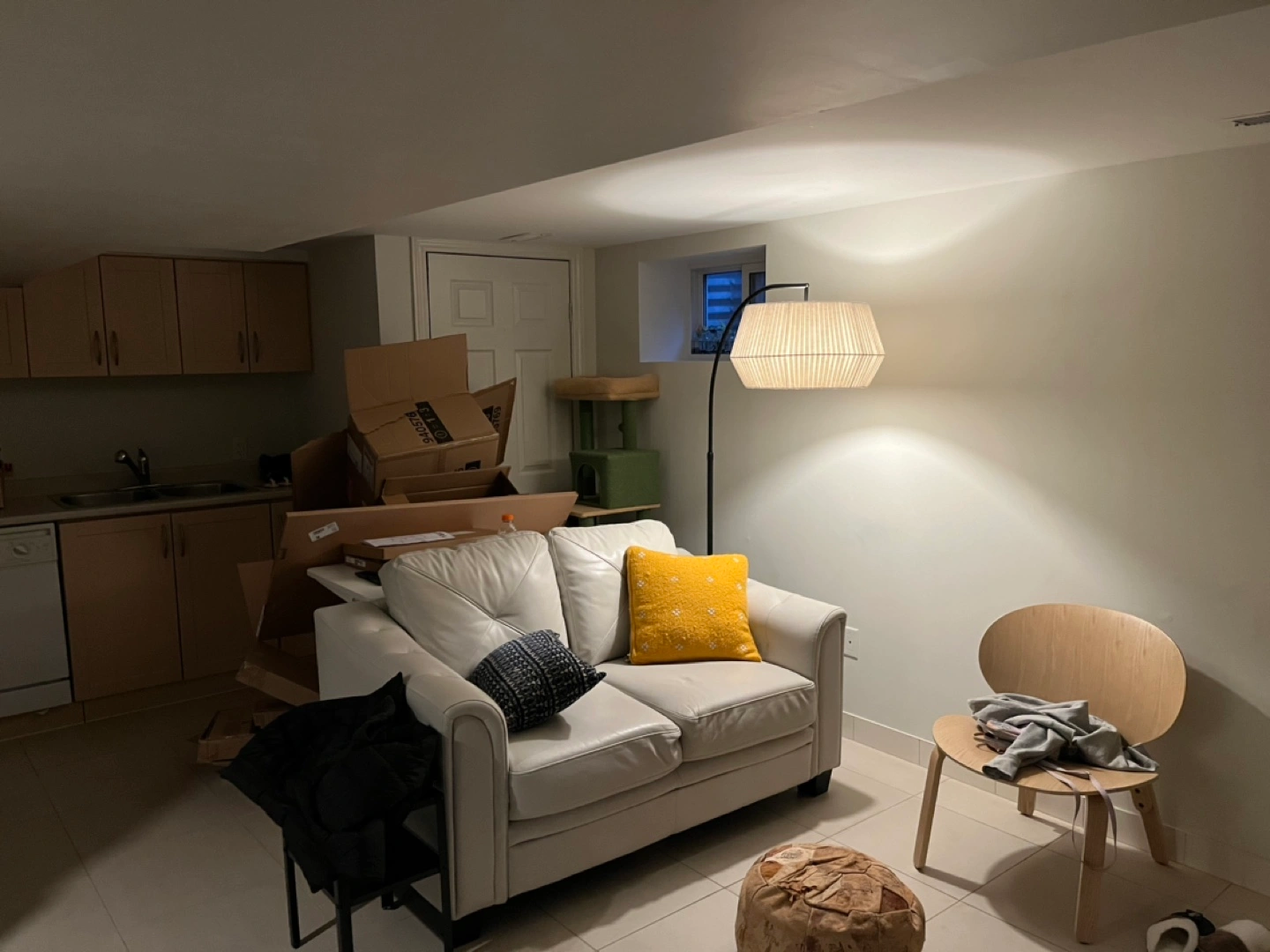Two-seater sofa, off-white leather. Small, good for apartment. Some small blemishes