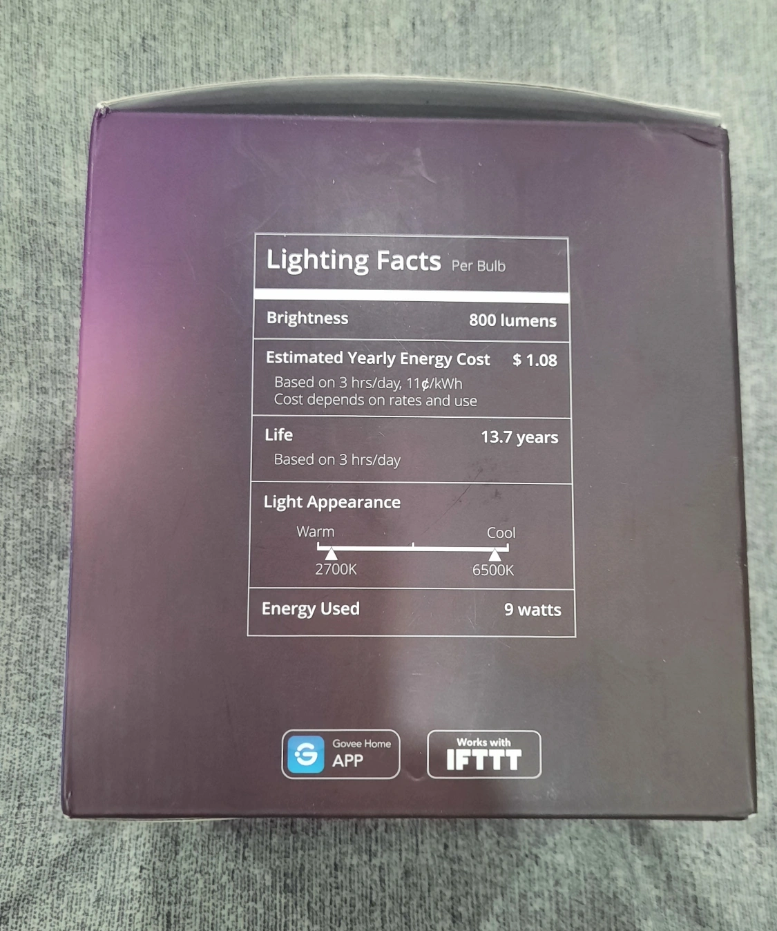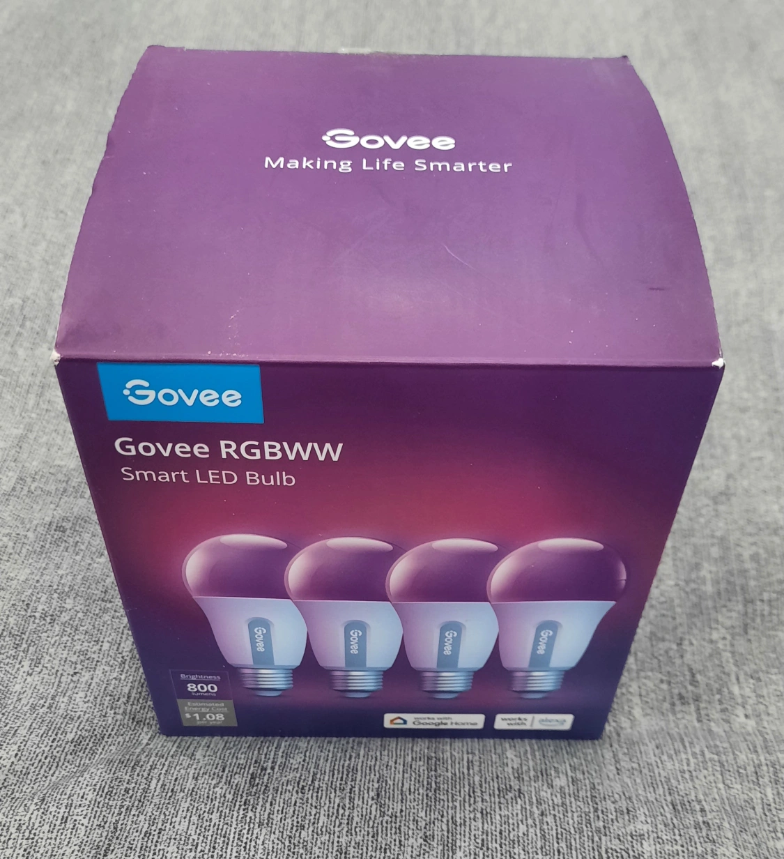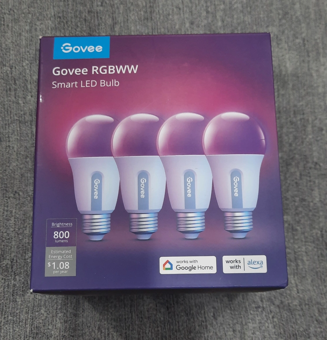4 pack New Govee RGBWW smart LED bulbs. Works with Google Home and Alexa. 800 lumens brightness. Estimated yearly energy cost $1.08 per bulb. 9 watts energy used. Colour temperature adjustable.
