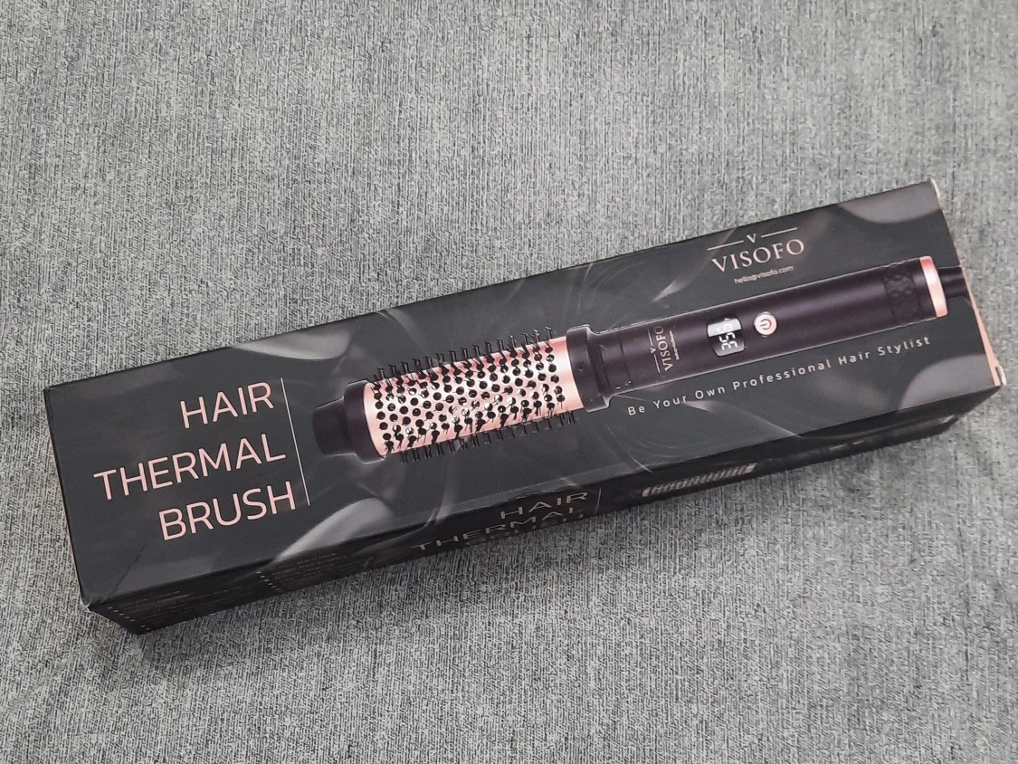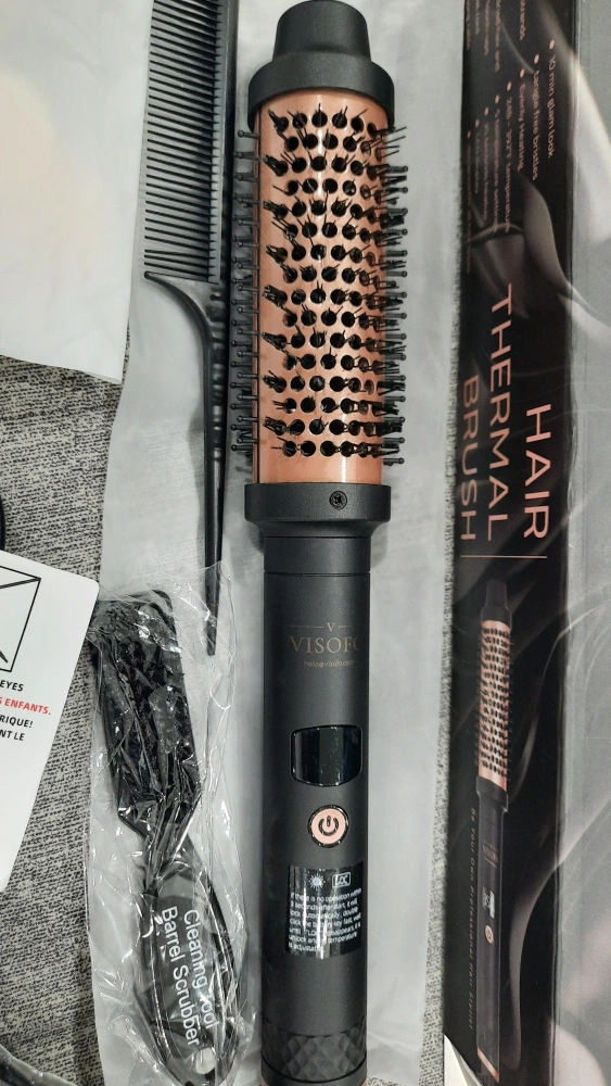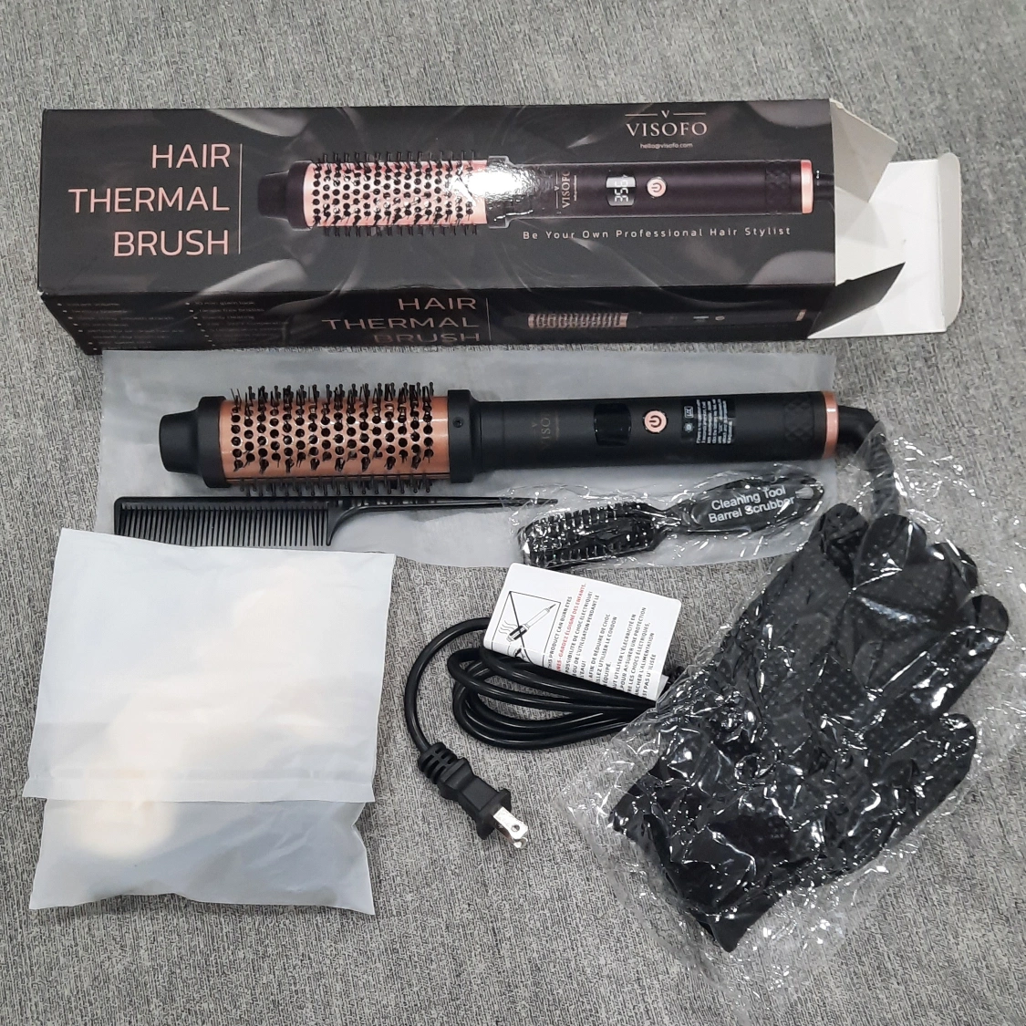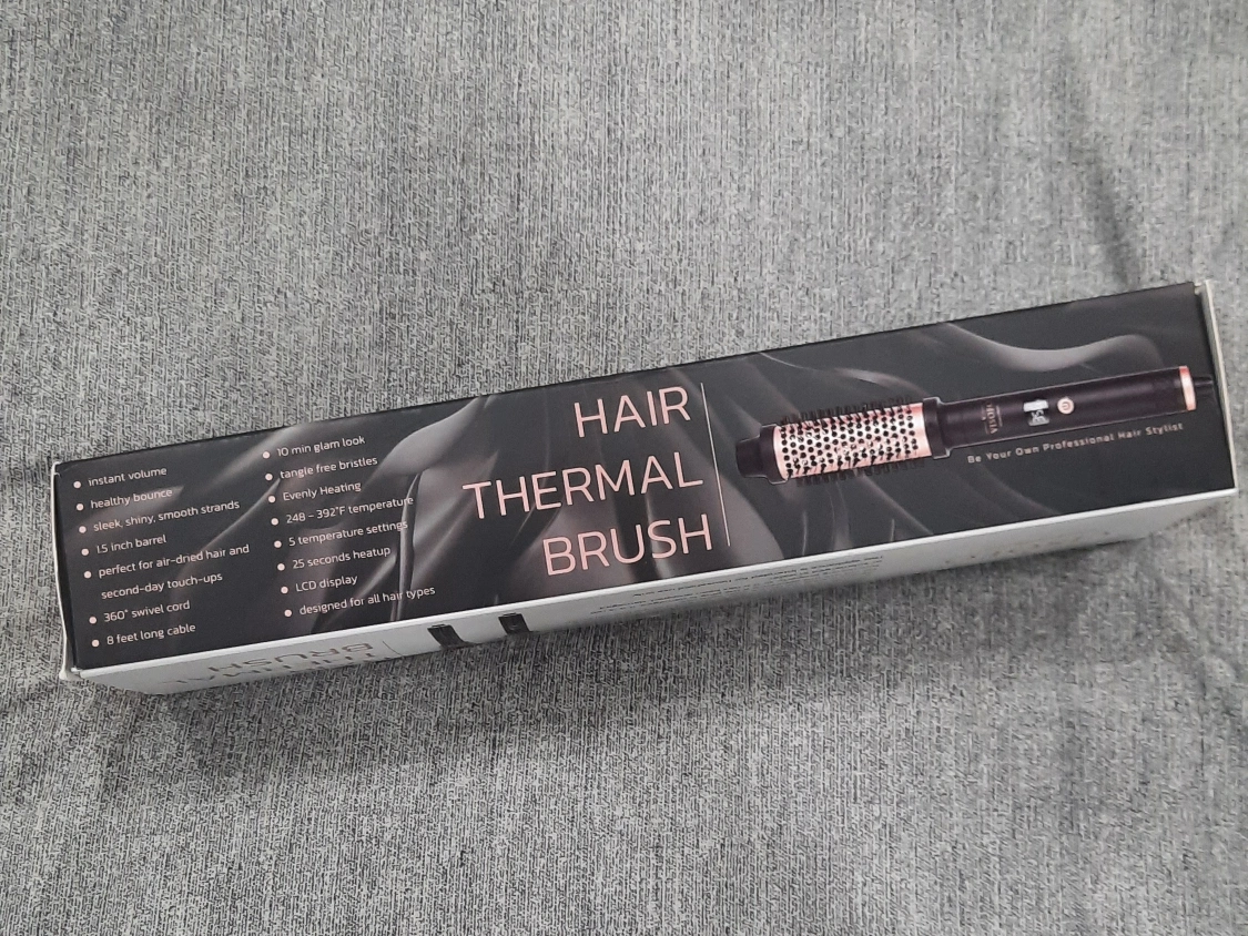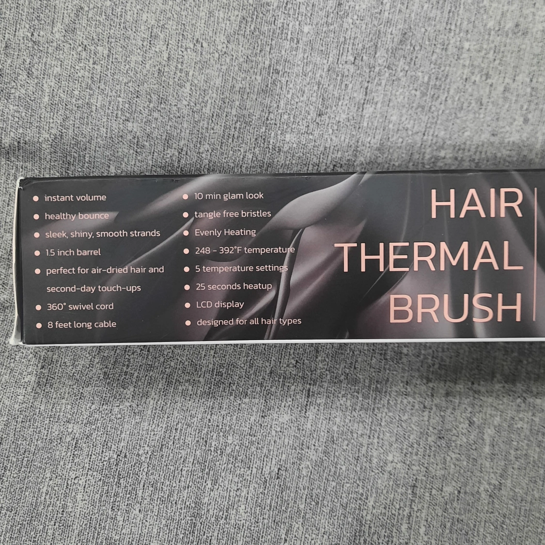 New hair thermal brush. Features 1.5 inch barrel, tangle-free bristles, 5 temperature settings. Eight foot long swivel cord. LCD display. Designed for all hair types.