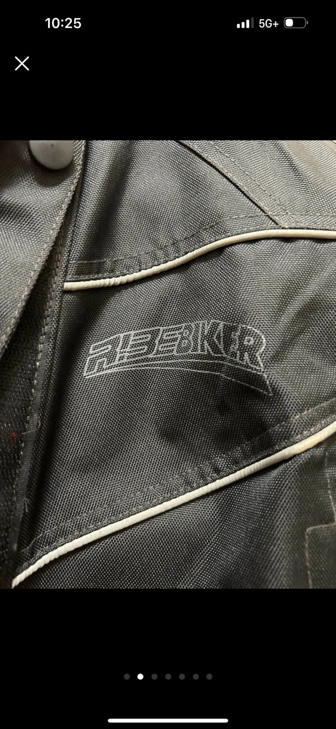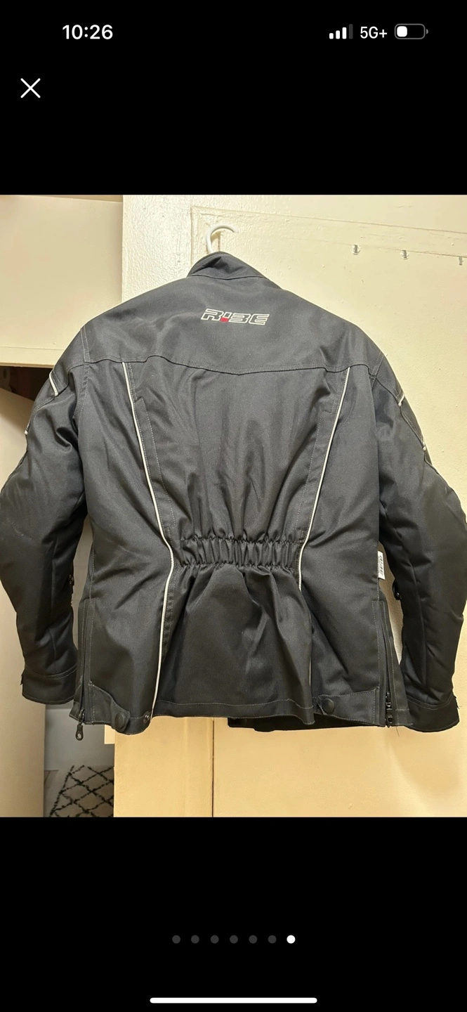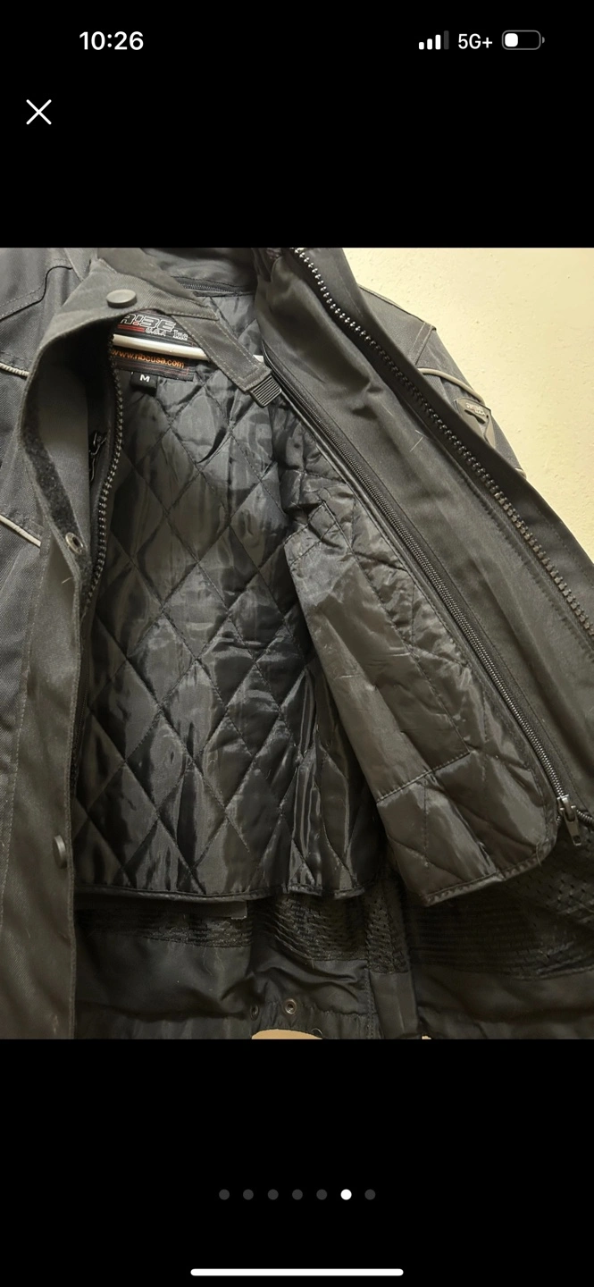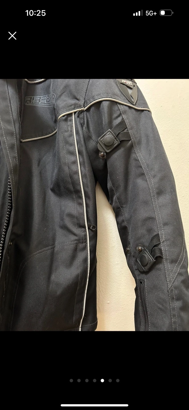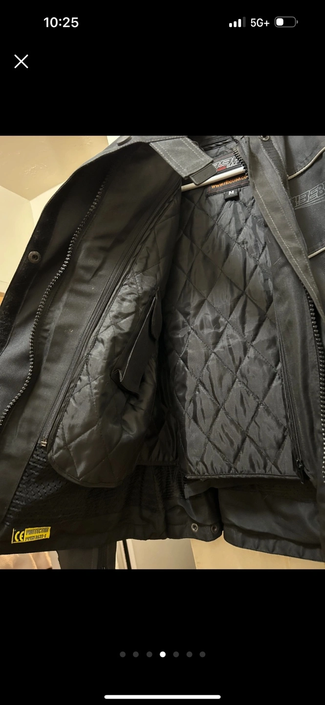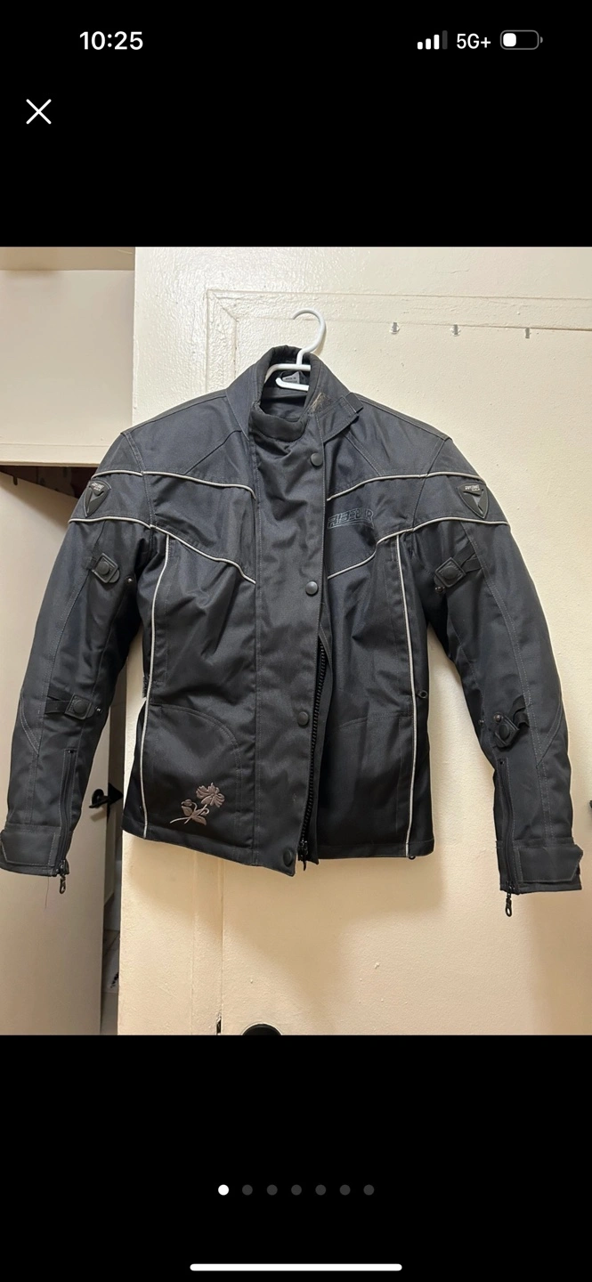 Black motorbike jacket. Size medium. Features multiple pockets and adjustable cuffs. Good condition. Great condition. Comes with armor and removable lining. Used only a few times. Says M but fits slightly larger.